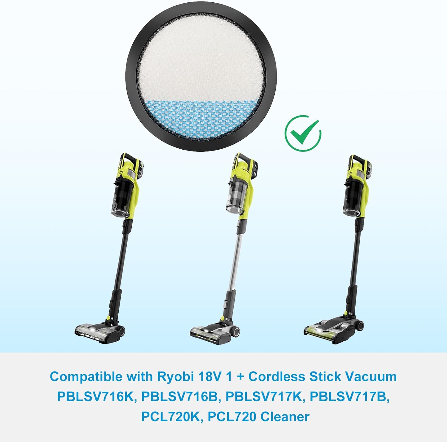 18v 1 + Cordless Stick Vacuum Filter compatible with Ryobi, PCL720, PBLSV716, PBLSV717, 18V ONE + Cordless Pet Stick Vacuum with Dual Roller Bar, Replacement for part A32SV720N.