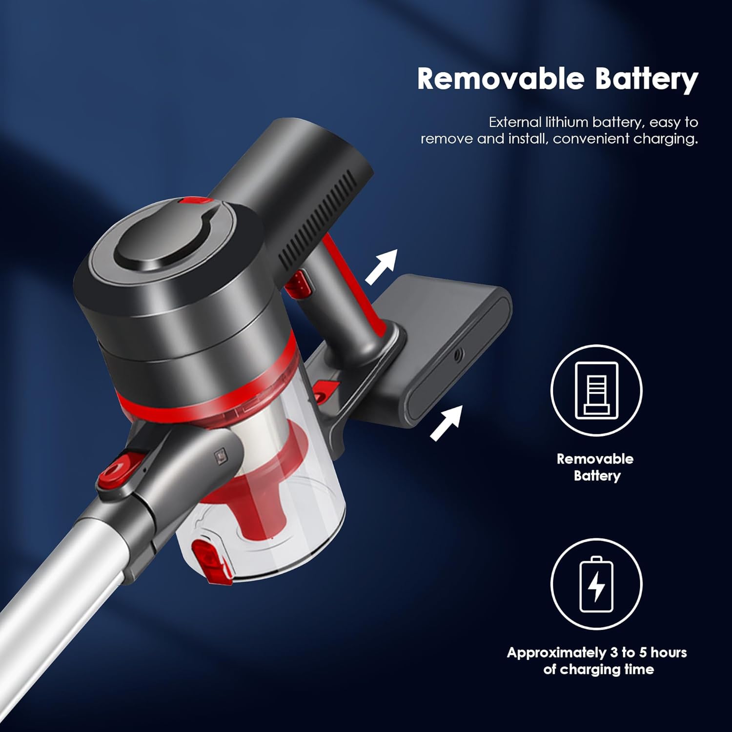 【Upgraded 30KPA Strong Suction Power】This cordless vacuum cleaner is equipped with 220W upgraded motor and 2 suction modes, the maximum suction power is up to 30Kpa, which can easily pick up all kinds of large particles of dust indoors and shorten your cleaning time. Suitable for hardwood floors, marble, shag carpet, blinds, tiles, pet hair and crumbs, etc.