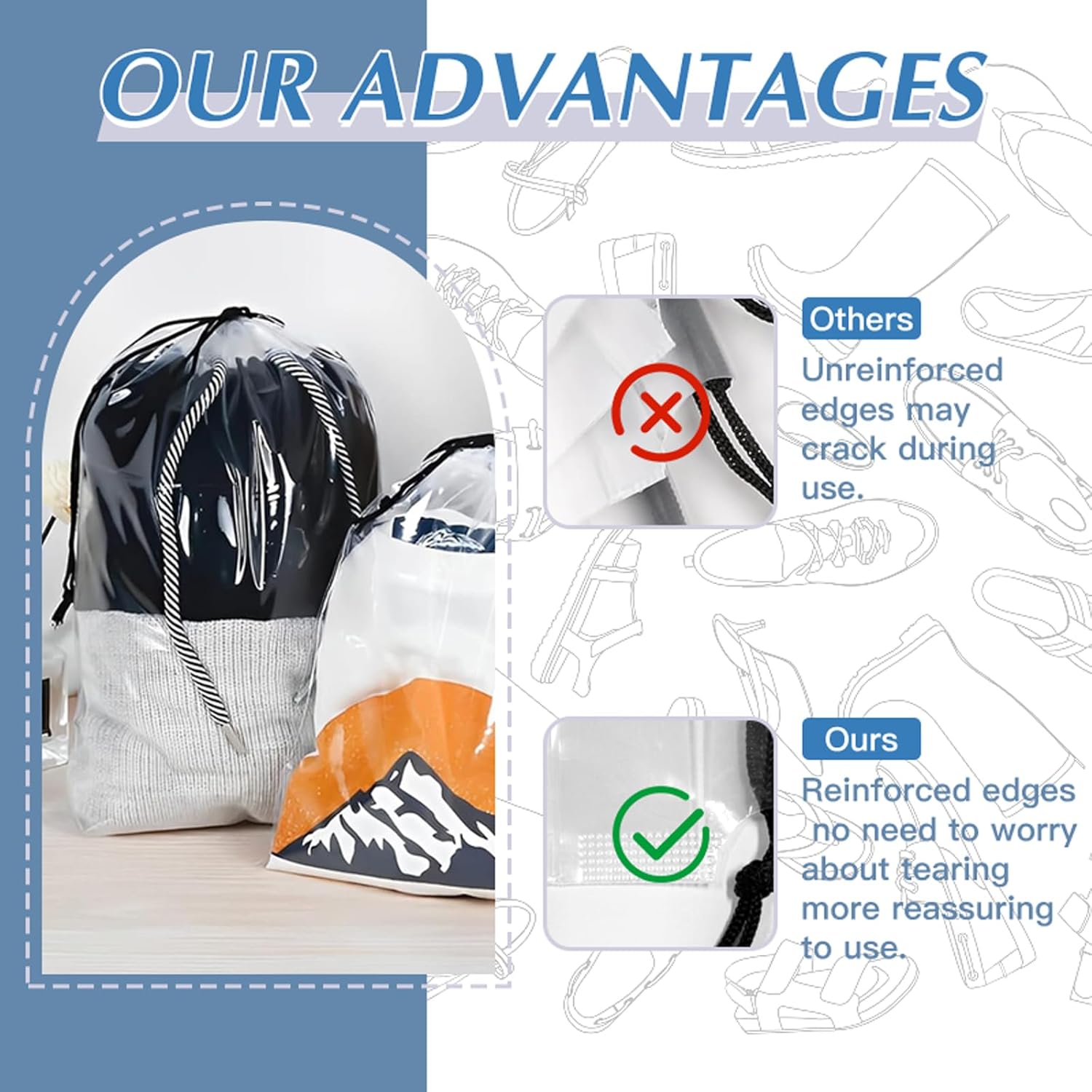 【Reinforced edges】: Our transparent shoe bags have been reinforced at the edges, making them less prone to tearing compared to other shoe covers.