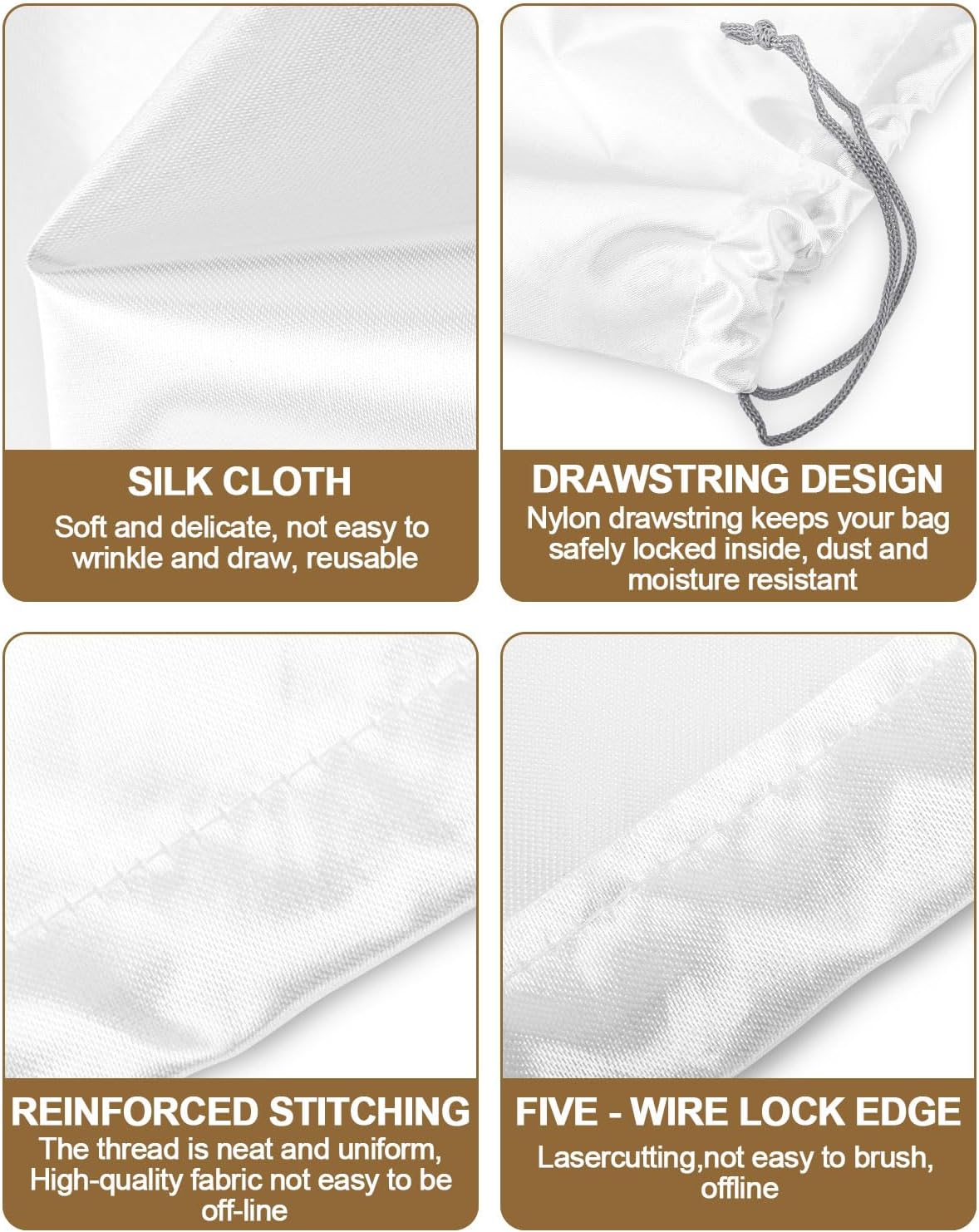 【Premium Quality Material】 These dust bags are made of fine silk fabric, soft and breathable, with excellent dust and moisture resistance to protect our bags from dust and damage. In addition the ideal thickness and softness of the silk cloth bag ensures durability and comfort. It is the best choice to protect bags and other valuables from dust and moisture