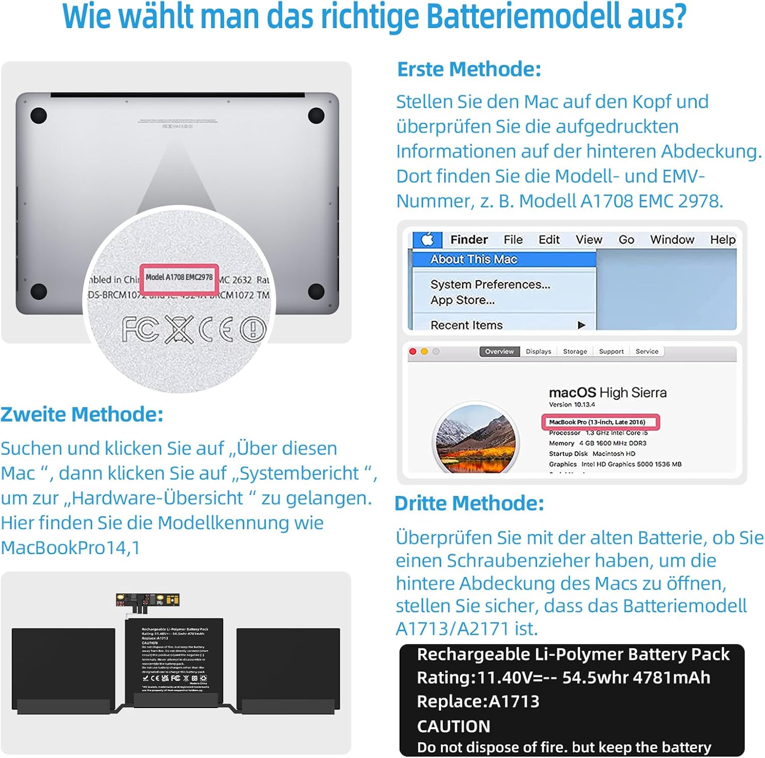 How to Get Correct Battery: First, upside down your Mac to get the exact model name & EMC numbers; Second, find and click on “About This Mac”, and the system model and release year is on the pop window; Third, follow the method 2 and then click on “System Report” the model identifier is on the “Hardward Overview”; Fourth, check the original battery to get the exact battery model number