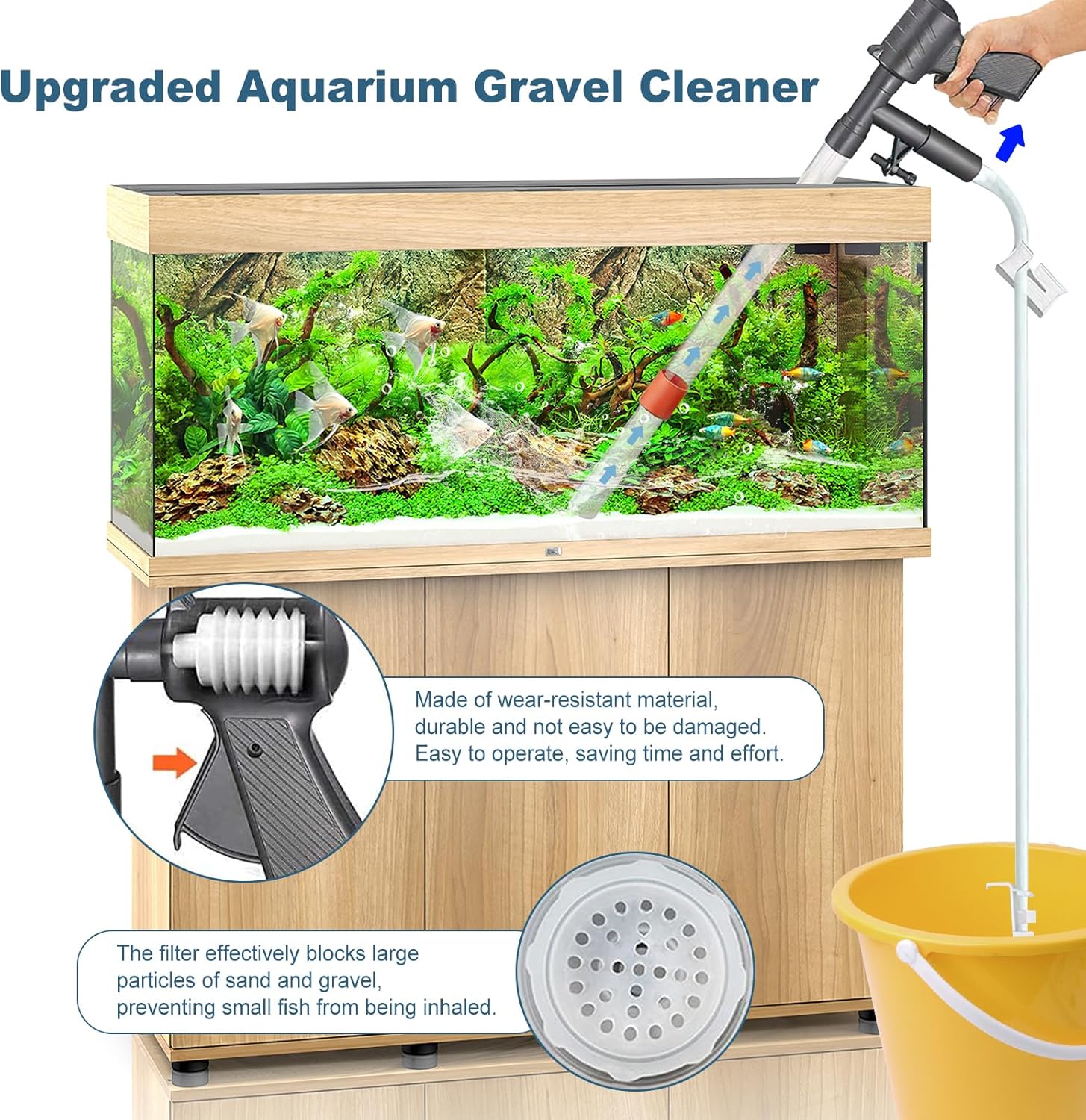 Efficient Cleaning: Press the air pump button a few times to quickly siphon water. Control water flow speed with fixing and flow clips to maintain ecological balance. Glass scraper helps clean algae and dirt from aquarium walls. Filter net attached to the filter basket blocks gravel and prevents small fish from being sucked out.