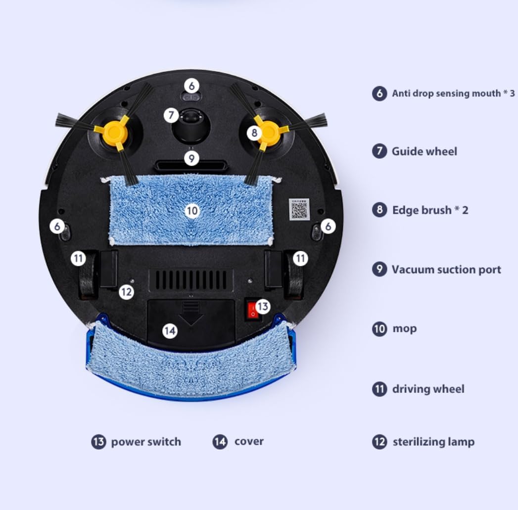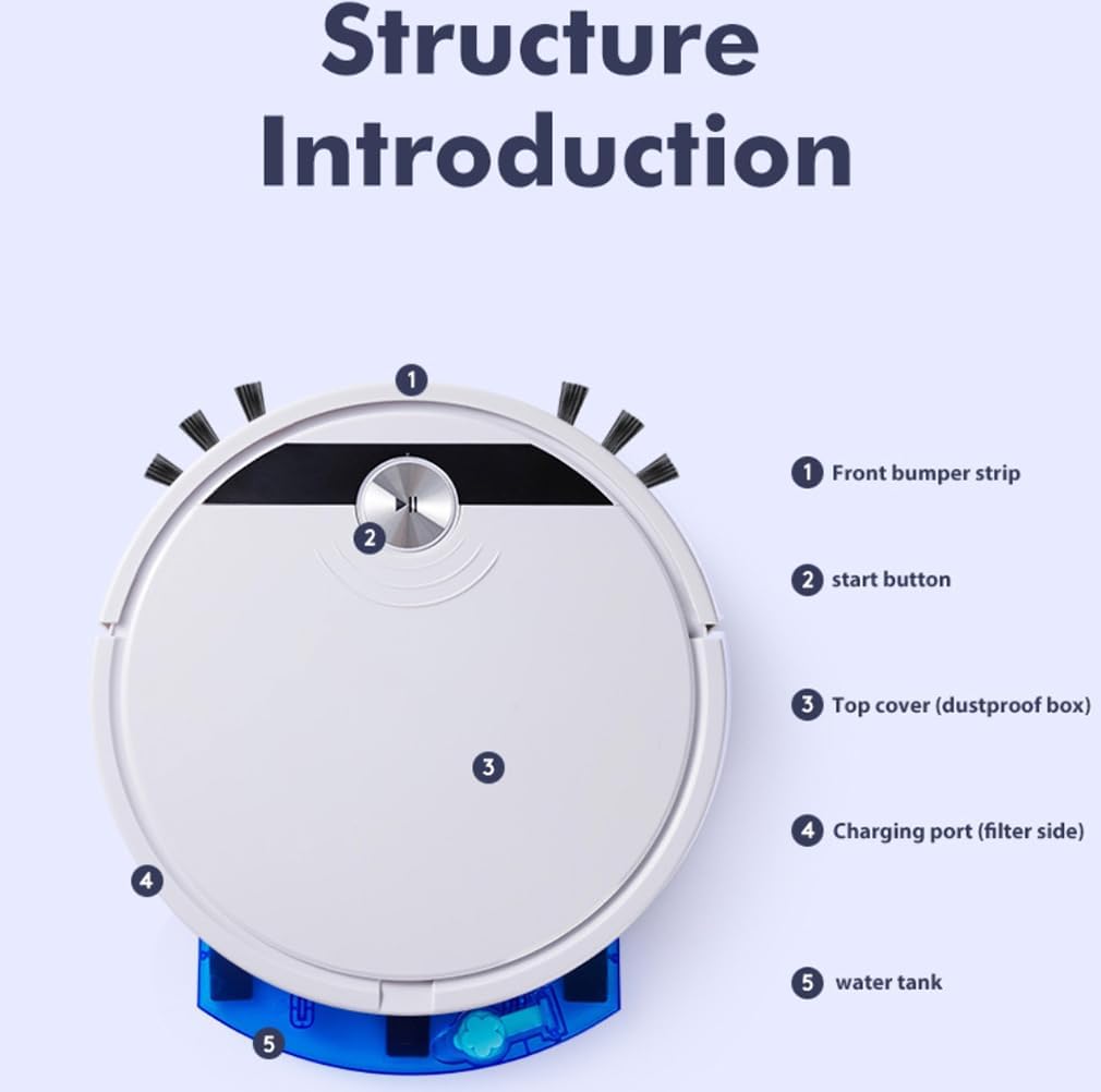 Five in one. Automatic sweeping, mopping, vacuuming, spraying, with LED ambient light. Detachable cleaning mop for deep and thorough cleaning. Easy to use and clean. All-in-one unit, perfect for large rooms, for all your cleaning needs. Less dust and more humid air. Very convenient and easy to use.