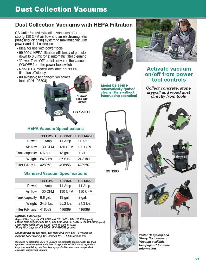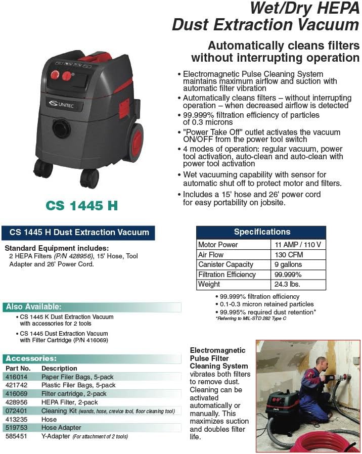 9 Gallon Wet/Dry Industrial HEPA Vacuum with a powerful 11 amp motor, electromagnetic pulse cleaning system, “Power Take Off”, 4 operational modes, wet vacuum capable, 99.999% filtration efficiency of particles down to 0.3 microns, including a 15′ and 26′ power cord for easy portability. CS Unitec, Inc. specializes in industrial power tools and safety tools for construction and industry. Innovation and high quality are synonymous with CS Unitec’s power tools. In 1991, the company invented the first pneumatic portable band saw. CS Unitec has added to its list of industry firsts with the widest range of portable magnetic drills and hand-held concrete core drills. The line also includes surface preparation tools for metal, concrete and masonry, air, electric and hydraulic portable band saws, reciprocating saws, hack saws, nut runners, rotary hammer drills, rolling motors, non-sparking safety tools, portable mixers and dust extraction vacuum systems. Please click on the CS Unitec link at the top of this page to see more quality products from CS Unitec.