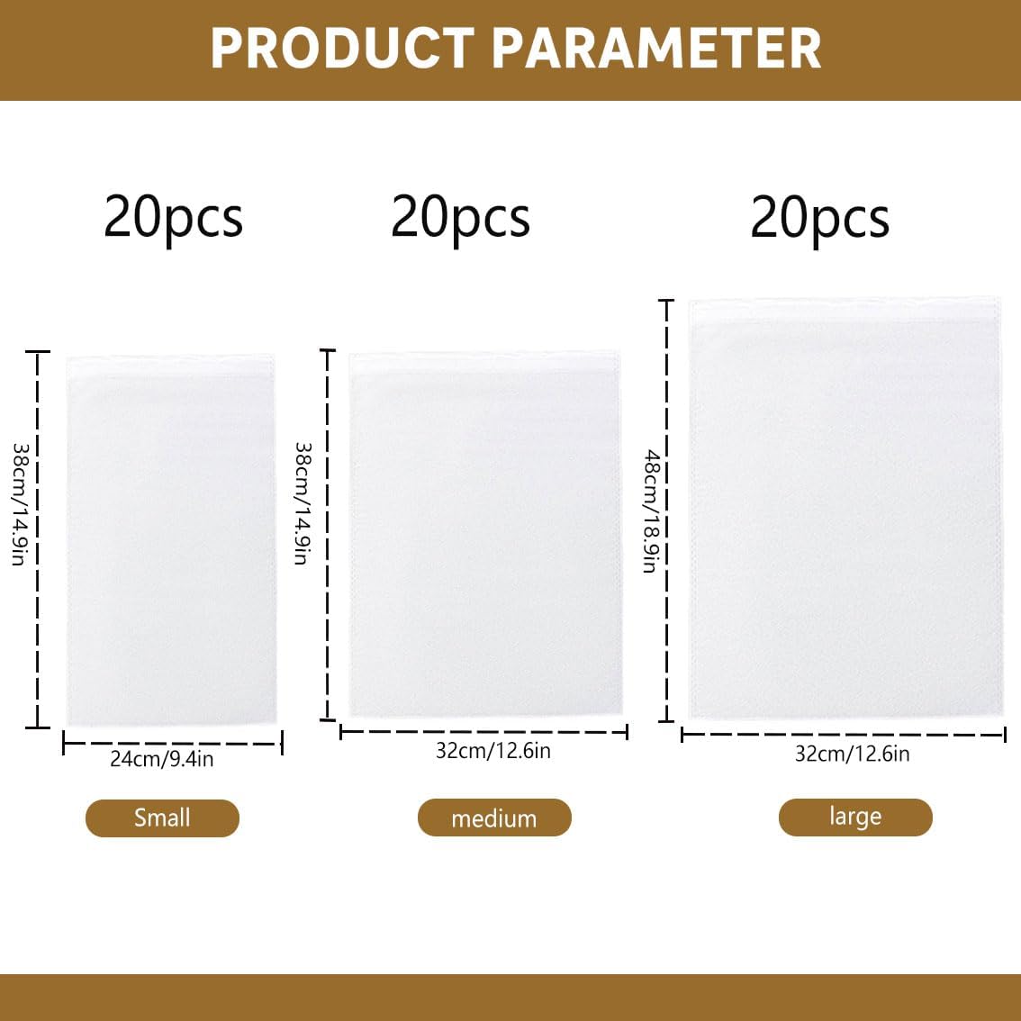 Product Size: 20pcs Large: 12.6 x 18.9 inches/32 x 48 cm, 20pcs Medium: 12.6 x 15 inches/32 x 38 cm, 20pcs Small: 9.44 x 15 inches/24 x 38 cm. This shoe bag sufficient quantity to meet your usage and replacement needs.