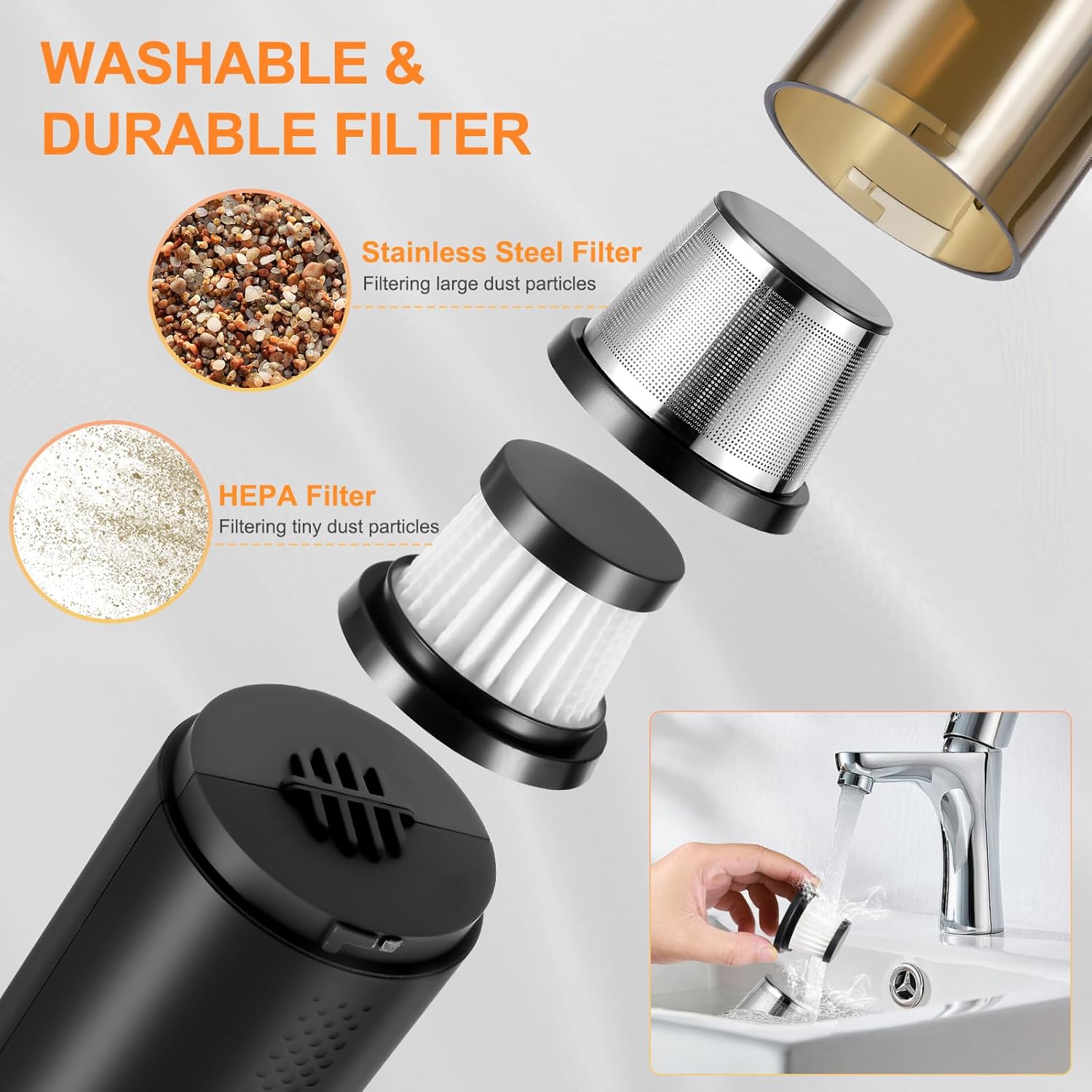 【EASY TO CLEAN】Easily pour out dust and clean it with a simple twist of the dust bin. The included hepa filters are all washable and reusable