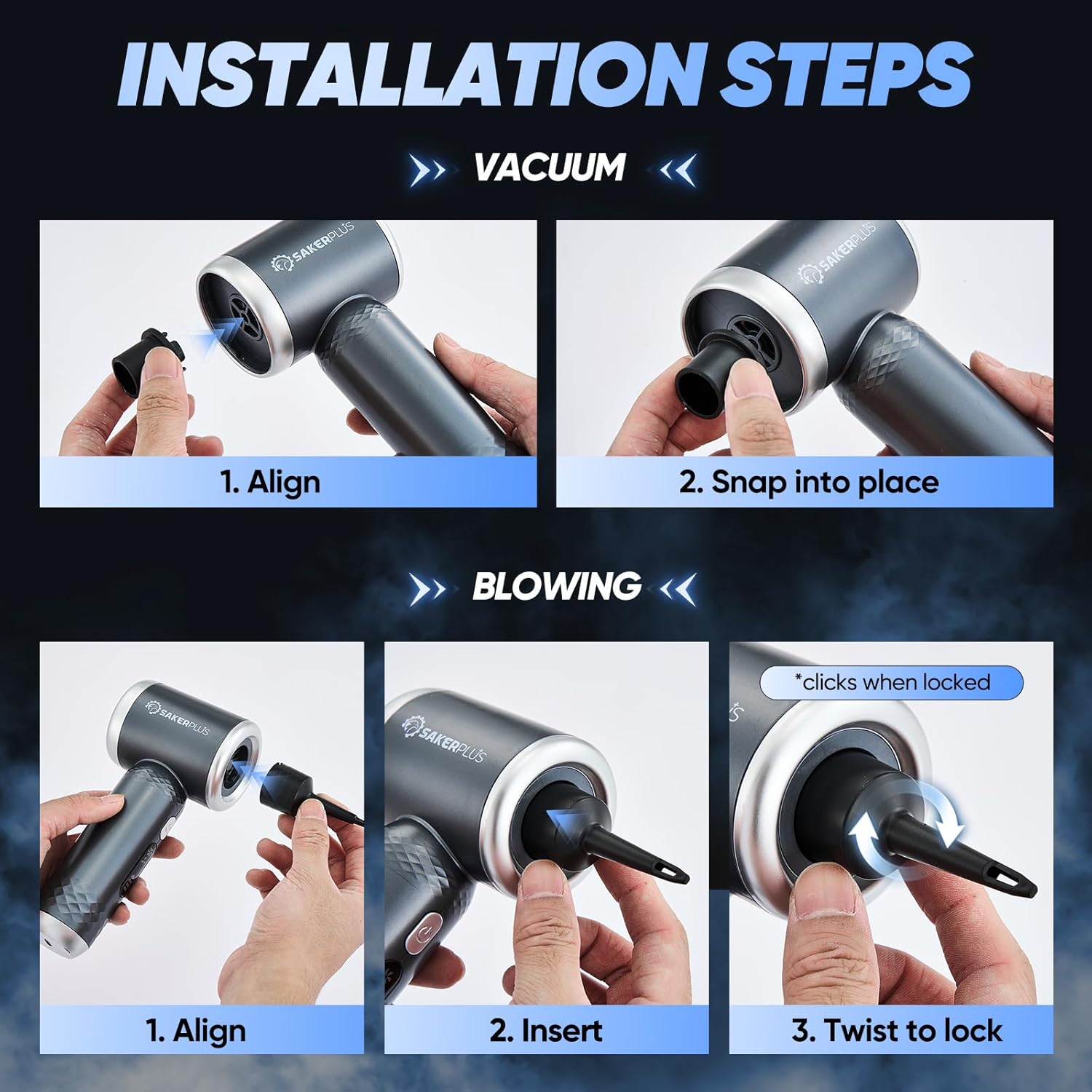 【3-In-1 Multifunctional Cordless Vacuum Cleaner】Sakerplus 3-in-1 vacuum cleaner combines Suction, Blowing & Inflation, Extraction functions. Powerful suction removes dust, debris. The blowing function cleans hard-to-reach areas like car interiors and keyboards. The inflation nozzle quickly inflates swim rings and balloons, while the Extraction function compresses items in storage bags. Perfect for both car cleaning and household use.