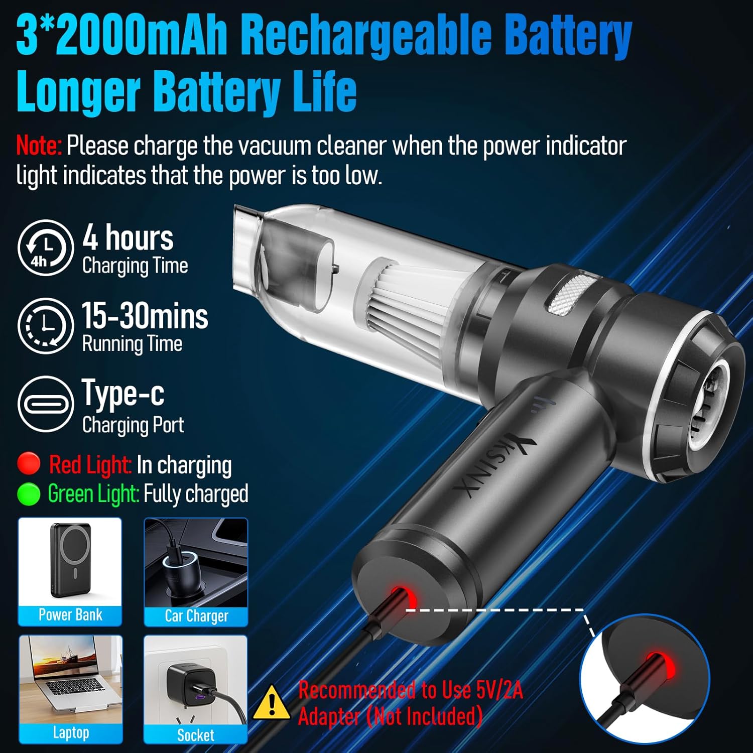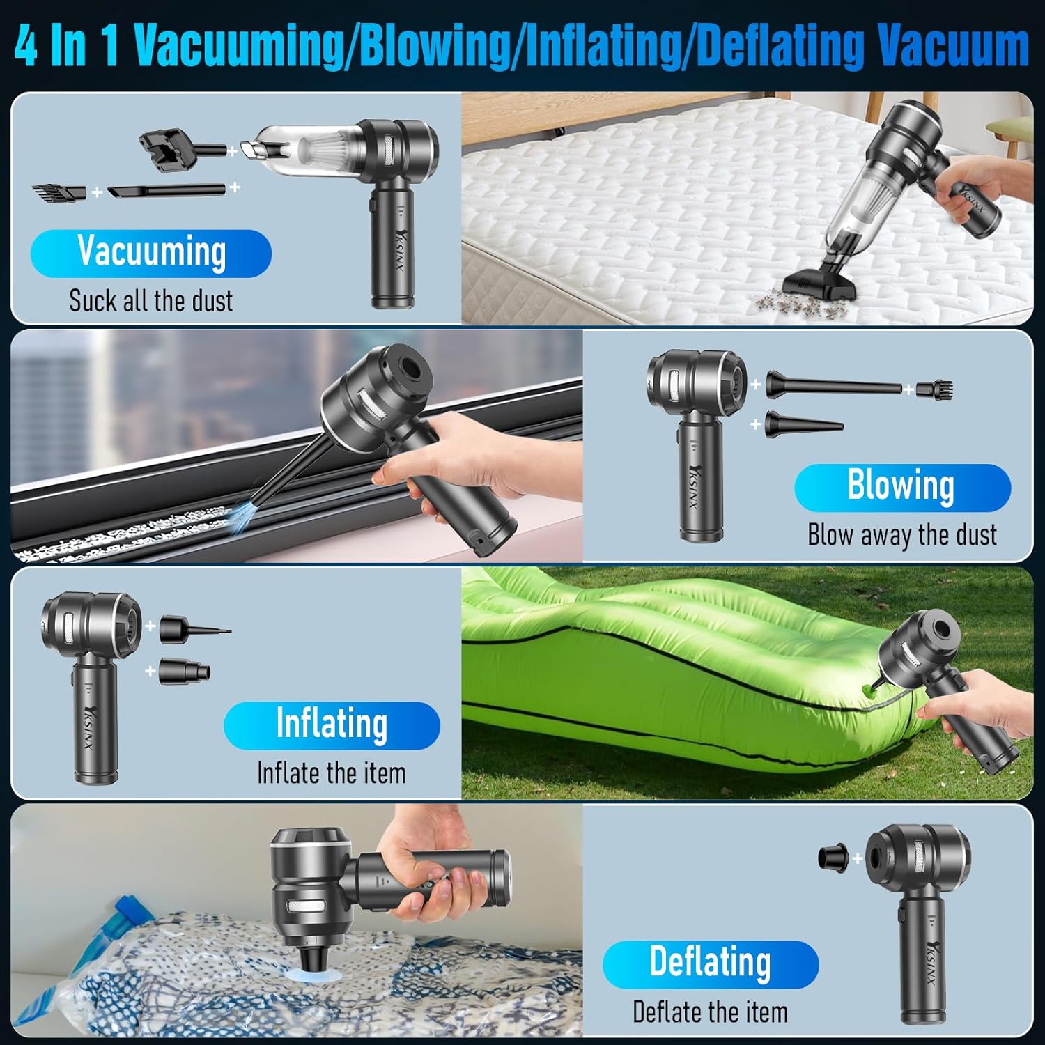 YKSINX portable vacuum cleaner comes with 7 accessories, not only as dust buster helps to keep home, office, car clean and tidy, but also as air duster to clean dust, at the same time as air blower to pump and inflate!