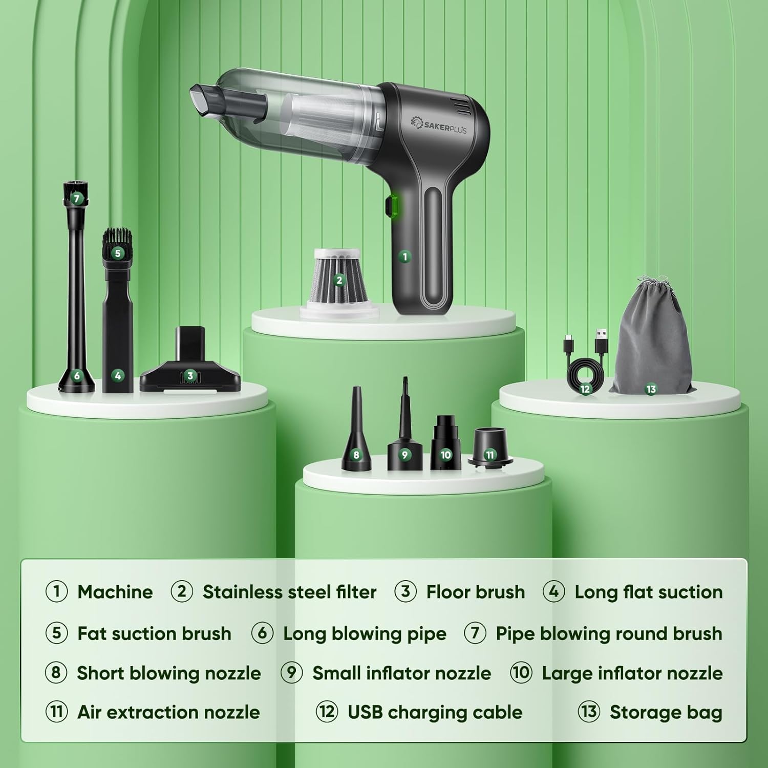 【VACUUM, BLOW & PUMP FUNCTIONS IN 1】SakerPlus mini vacuum cleaner integrates vacuuming, blowing, and pumping functions in one device. With its brush and nozzle attachments, it effortlessly tackles crumbs, pet hair, and dust in carpets, upholstery, narrow spaces, and crevices like computer keyboards and mainframes. Additionally, it serves as a BBQ fan and a tire inflator, adding versatility to its capabilities. (CAN’T ABSORB WATER OR LIQUID)