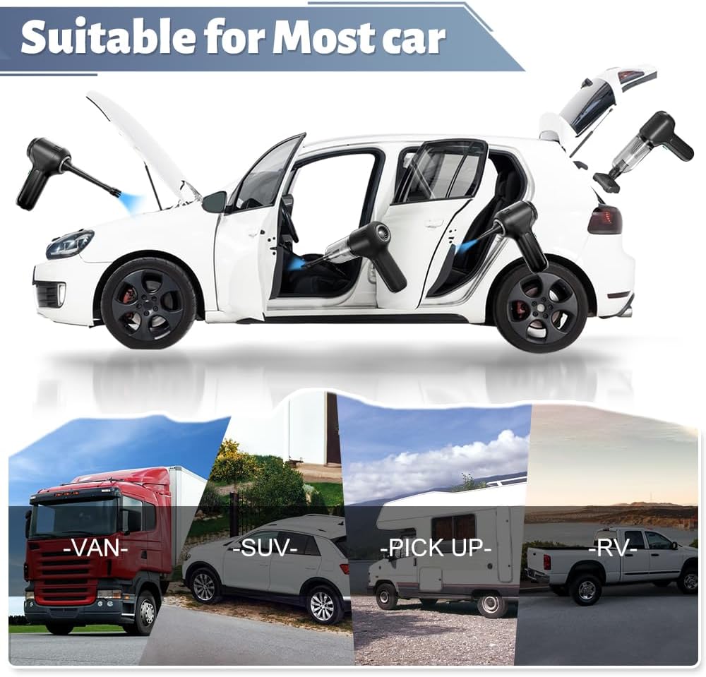 Powerful Suction Car Vacuum Cleaner:High-performance car vacuum cleaner featuring a brushless motor and two adjustable suction modes: 10,000pa/18,000pa. Equipped with a turbocharged dual-blade rotating speed of 98,000rpm, that is 80% stronger than regular vacuum cleaners. which can clean the rubbish and dirt in 1 second and lasts longer than ordinary motors during use. Diverse everyday cleaning requirements, making it an ideal assistant for maintaining both car and home spaces.