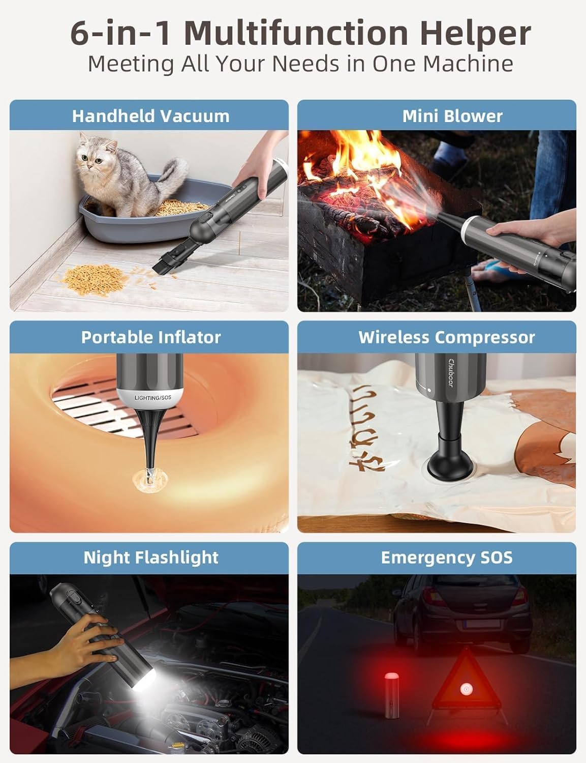 【6-In-1 Vacuum with Multi-purpose Use】This 2023 New fantastic, portable vacuum cleaner is one of the most compact yet functional units available on the market. P13 combines the vacuum cleaner, air pump, inflator, blower, led flashlight and SOS Emergency light in one design, and easily deals with your variety of needs in most areas of your house/office/car.