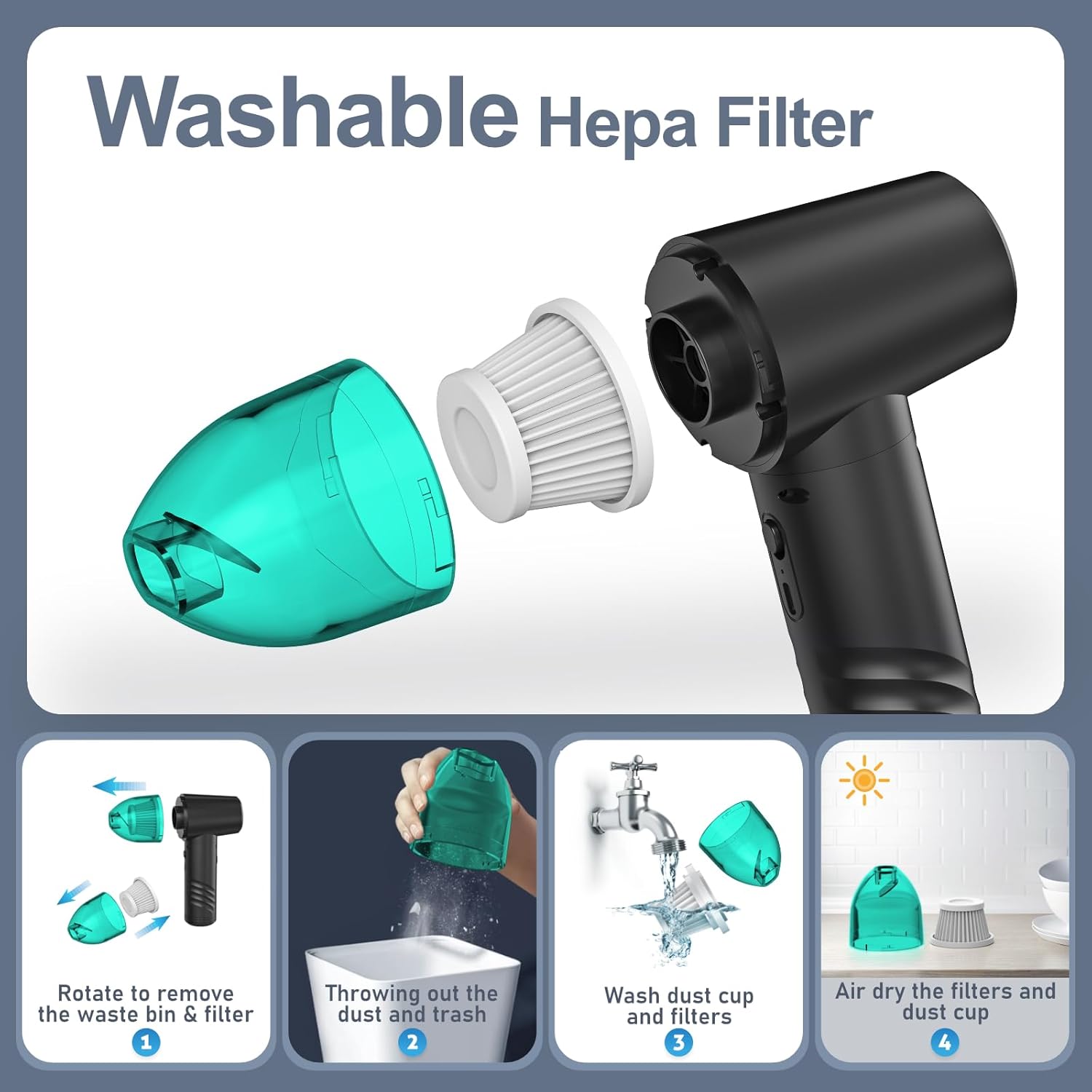 Reusable and Washable Filter: Air Blower has the reusable HEPA filters that are washable and air-dry, and the service life can be more than 1 year. Parents and car owners no longer have to worry about guests, children and pets dirty the car and home, with this mini vacuum cleaner to help you clean efficiently, enjoy the style of life