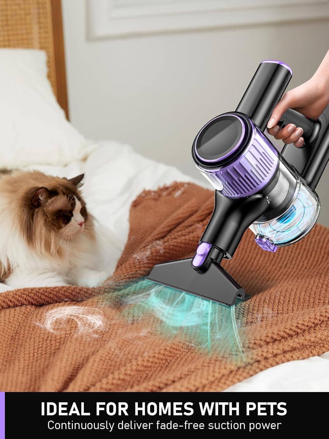 Ultra-Lightweight Design for Easy Handling: Weighing just 2.9lbs, this cordless vacuum is ergonomically designed for easy one-handed operation. The flexible head rotation allows you to effortlessly clean around furniture and tight spaces, reducing fatigue during long cleaning sessions.