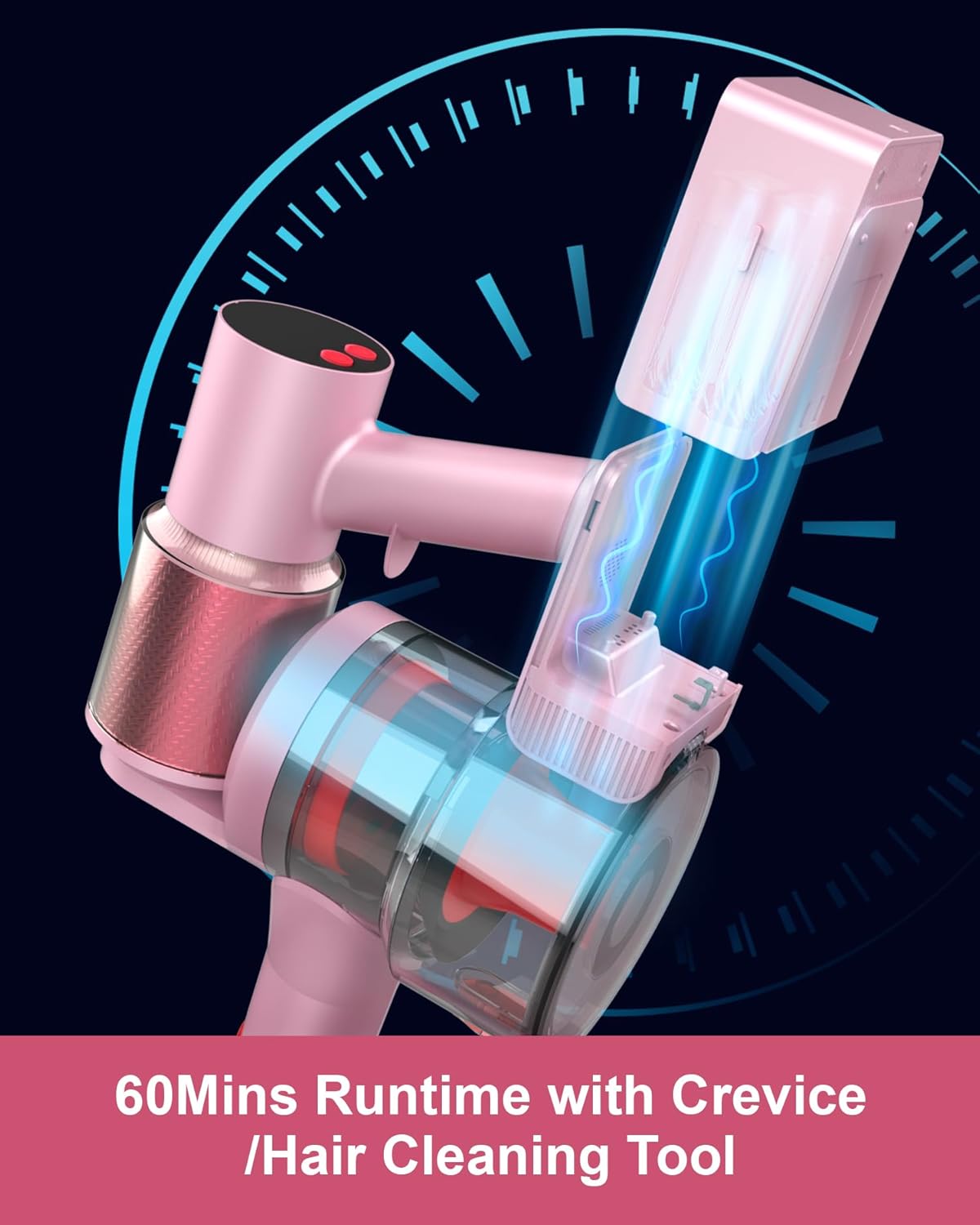 Cordless Vacuum Cleaner, 45Kpa/550W/60 Mins Runtime Stick Vac with Anti-Tangle Design, Self-Standing, LED Screen & 1.5L Dust Cup, Vacuum Cleaners for Home, Pet Hair, Carpet and Hardwood Floor, Pink