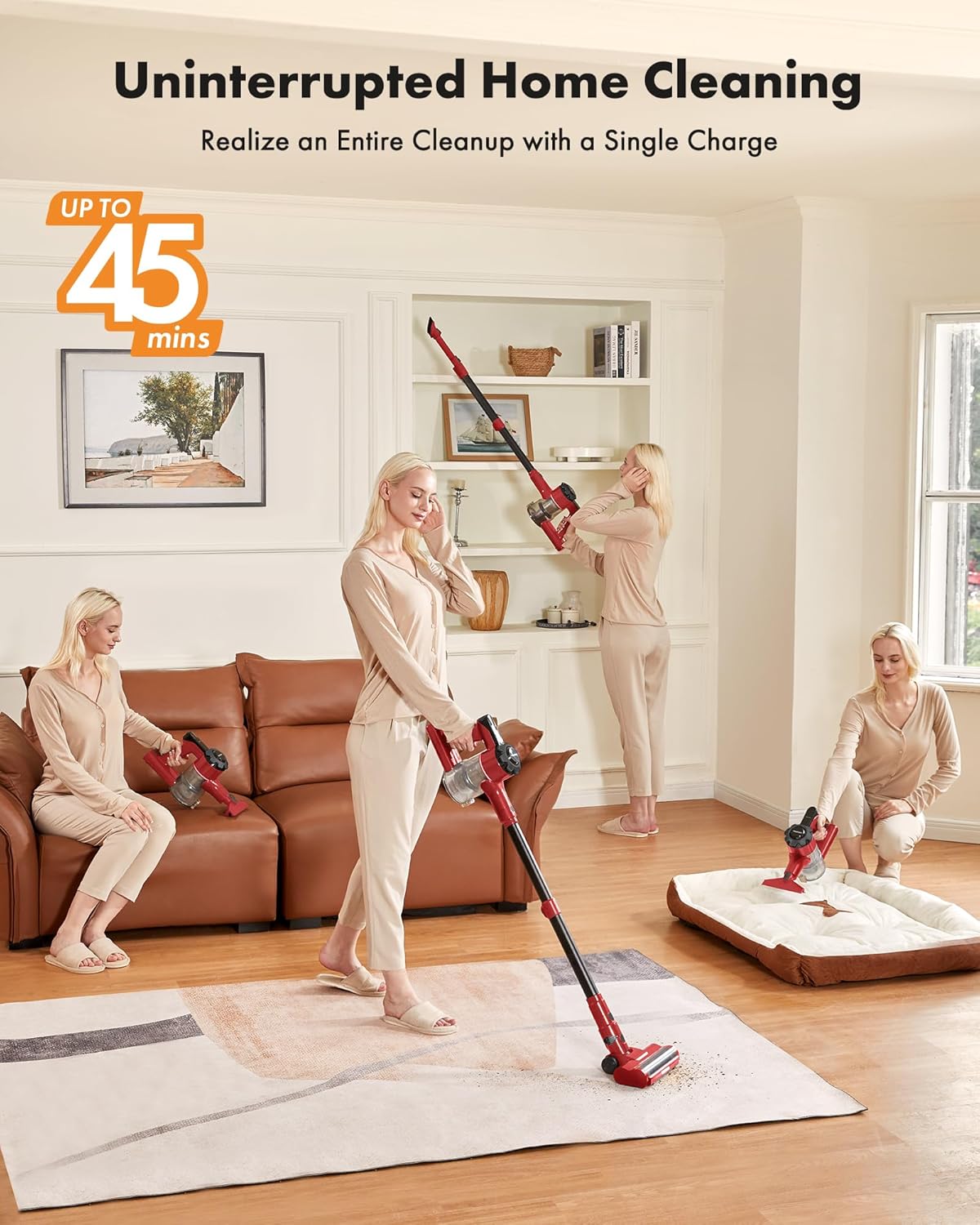 Cordless Vacuum Cleaner, 8-in-1 Lightweight Stick Vacuum with 45mins Runtime, Powerful Suction, Rechargeable Cordless Vacuum for Carpet, Tile, Pet Hair, Hardwood Floors, Red