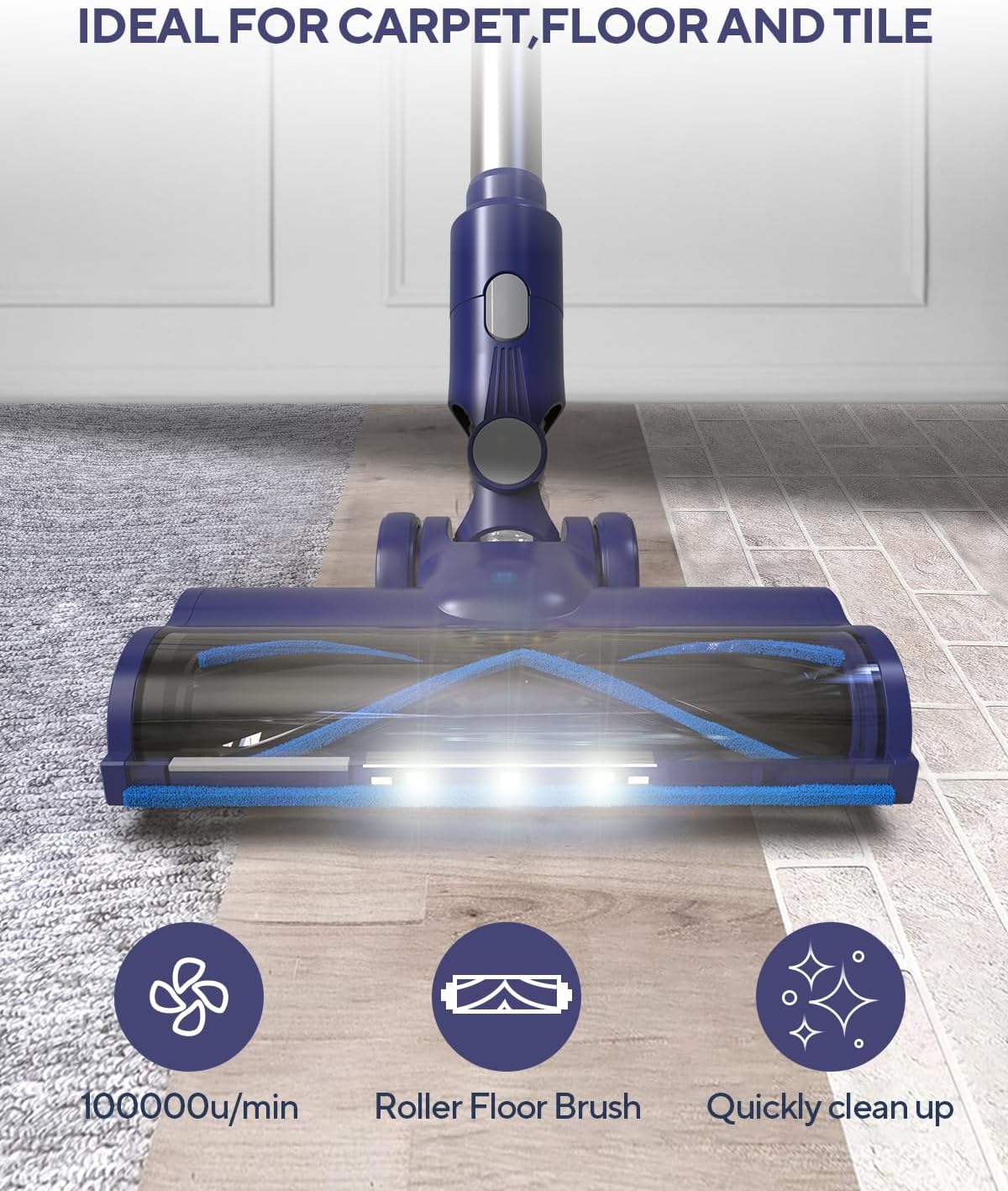 LED Touch Screen and Flexible Floor Brush Headlights: home cordless stick vacuum offers real-time information; controls Auto, Low, Mid, Max 4 suction mode.headlights concealed areas, leaving hidden areas free of pet hair and debris on carpet and floor