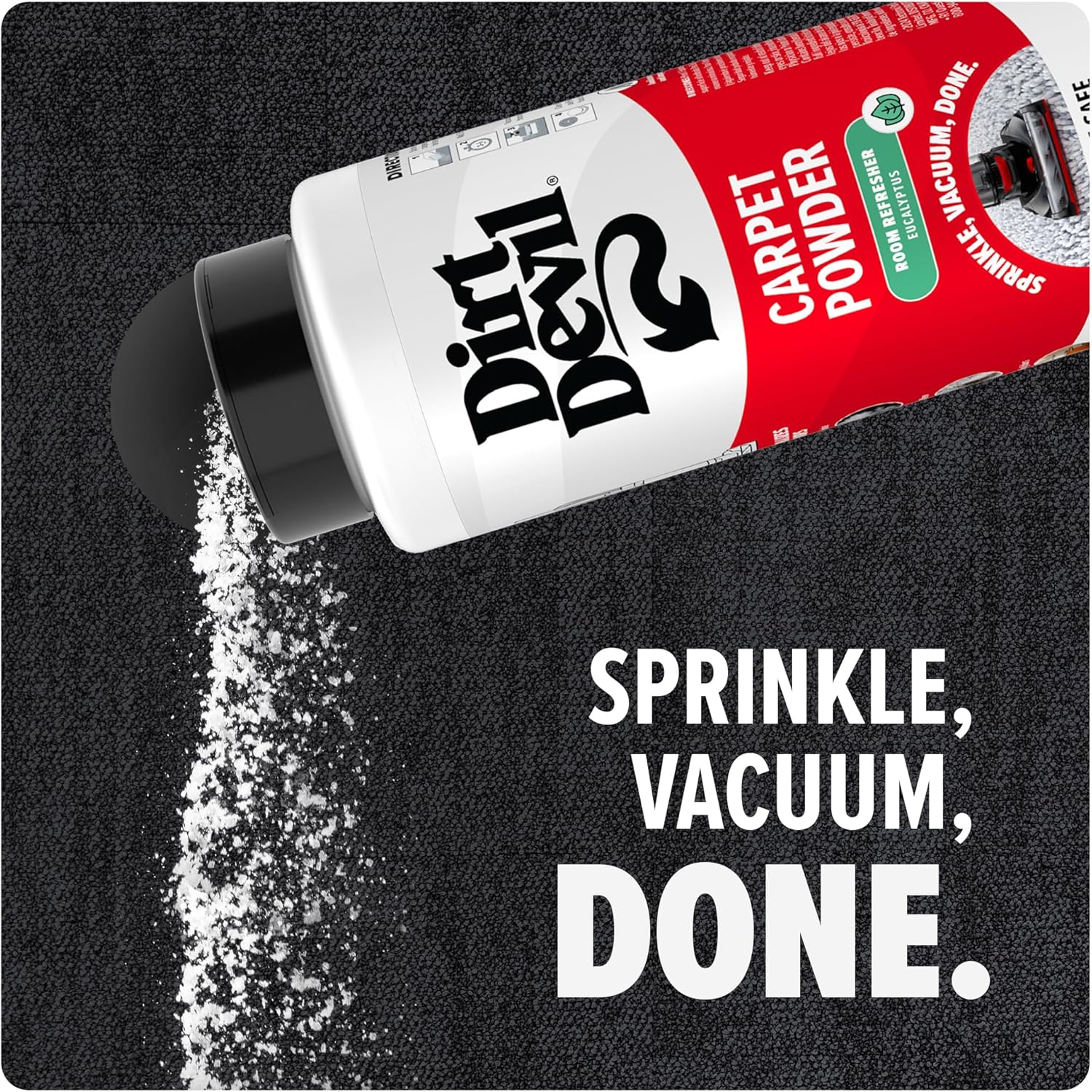 The Dirt Devil Carpet Powder enhances any vacuuming session with a Eucalyptus scent that lasts for days to help refresh any room. Simply sprinkle the carpet powder on any carpet, rug, or a variety of other surfaces like upholstery and more, wait a few minutes and vacuum it up to leave behind the scent of a Eucalyptus – all without worries of vacuum damage. Refresh the home and reduce odors like smoke, mildew and cooking odors.