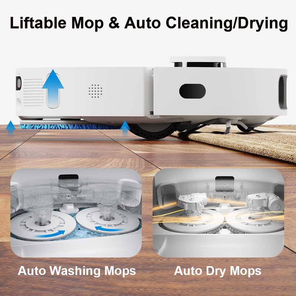 DUAL SPINNING MOP, LIFTABLE MOP AND AUTOMATIC DRYING: The dual rotating mop spins at 180 RPM and comes with a 3 L water tank to cover 2,152ft² house; The mop rises when it returns to the base, then removes dirt automatically and dries itself;