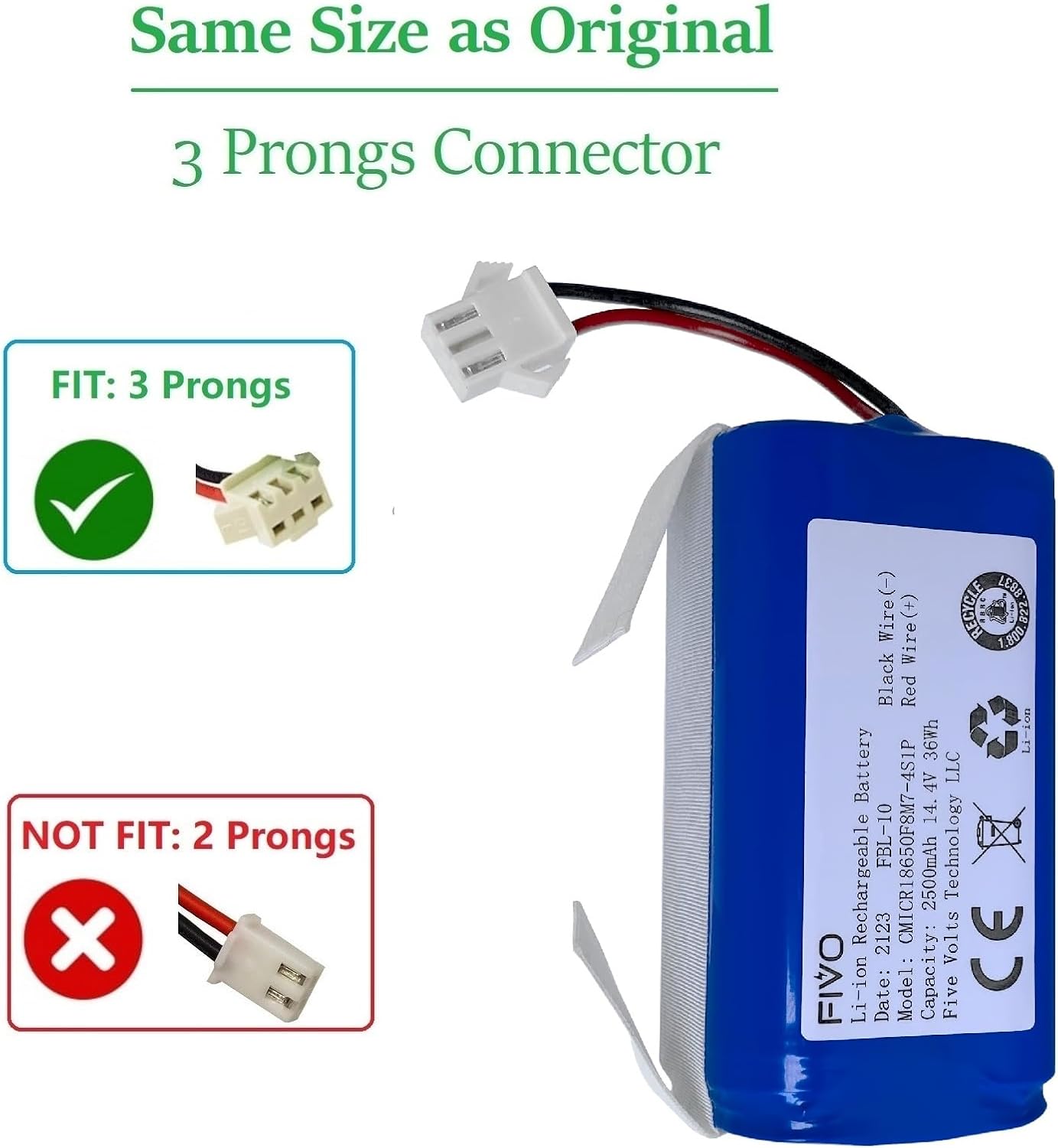 14.4V/14.8V 2600mAh premium Li-ion rechargeable replacement battery makes your machine run longer and durable. 3 prongs and 2 wires, same voltage, capacity and size compare with original battery. Model on product lable may vary.