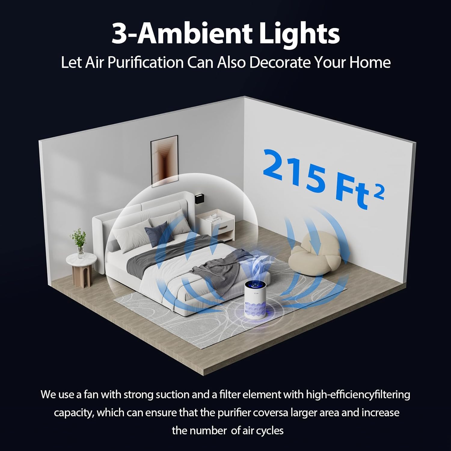 🚀【 】Designed with dual-channel air inlet and 360-degree air outlet, this air cleaner can refresh the air in a room up to 215 ft² / 20 m² for 5 times/hour.Quickly provide fresh air to your room.