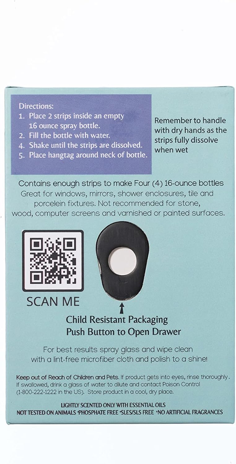 This eco friendly glass cleaning concentrated strips work well and offer a limited waste alternative to what we typically find in the big box stores. I like that it is easy to use and small enough to store without taking up much space. Two strips mixed with 16oz of water will make a full bottle of cleaner. You get 4 bottles work in this pack which in all essence is comparable to many window cleaners even the non eco friendly ones. You will need to have a bottle on hand in order to use this. You can use an 8oz bottle if you do not have or cannot find a 16oz, just use only 1 strip in 8oz of water instead. The strips dissolve fairly quickly and the mix has a slightly floral scent which is pleasant and not overpowering. The cleaner works pretty well, though I do feel it took slightly more effort to get the windows completely cleaned and streak free. This may vary depending on what you use to wipe with. The box that the strips come in has a child resistent opening. You will need to push it in and try to slide it towards the direction the drawer would open in at the same time. This may take one or two tries but it is easy enough. It also comes with a little tag to put on the bottle so you know what cleaner is inside it. Overall, nice product at a competitive price. Would recommend.