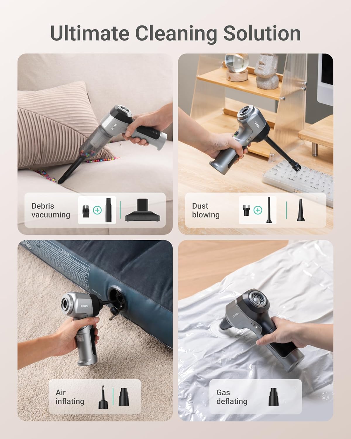 Ultimate Cleaning Kit: With 8 attachments, this hand vacuum cordless handles everything from pet hair on sofas to tight car crevices. Perfect for vacuuming, inflating, deflating, and blowing dust off furniture, electronics, and more.