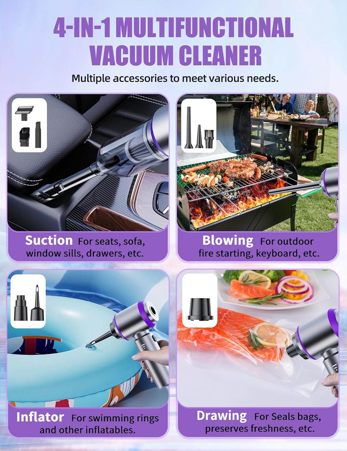 Versatile 4-in-1 Functionality:This car & home cordless vacuum cleaner seamlessly integrates suction, blowing, inflating, and vacuum sealing capabilities. Perfect for cleaning car mats, sofa cushions, blowing dust from keyboards or starting fires outdoors, inflating swimming rings and toys, and quickly vacuum-sealing storage bags.