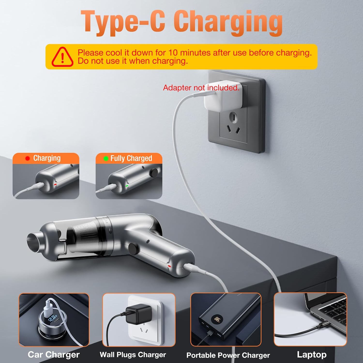 Cordless/Rechargeable Car Vacuum: Hand held vacuum cordless cleaner can be recharged using included USB charging cord. When rechargeable handheld vacuum cleaner is fully charged, vacuum cleaner’s charging indicator light will turn green, providing a longer period of continuous cleaning power. Cordless design allows you to carry vacuum cleaner wherever you want to clean so you don’t have to worry about messy cords, and handheld vacuum cleaner comes with a Type-C cable for charging in car or home