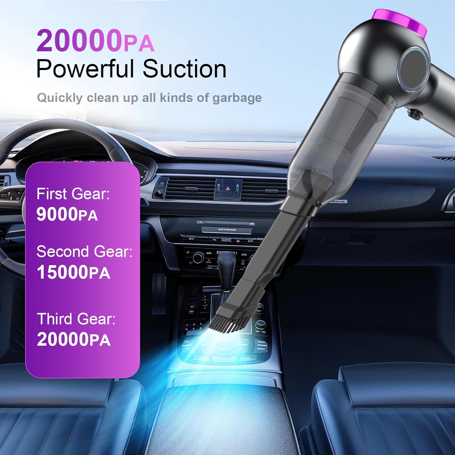 【20000Pa Powerful Suction & Brushless Motor】Compared to traditional motors, this car vacuum cleaner features cutting-edge brushless motor technology and has a strong suction force of 20000Pa and a high speed of 80,000RPM, providing a powerful cleaning power to deal with the car dust, pet hair, food scraps and other common stains.