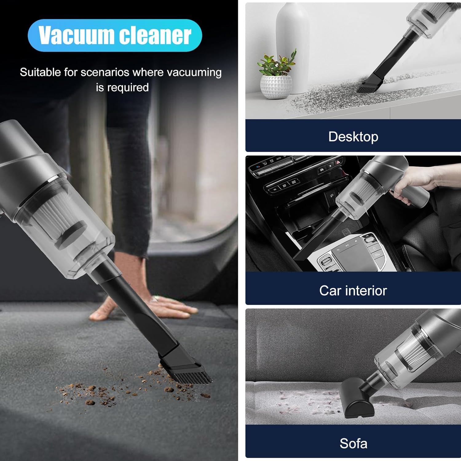 Multifunctional handheld vacuum cleaner cordless 4 in 1: This portable vacuum cleaner is equipped with various accessories: suction nozzle and brush, floor brush, blow brush and nozzle, which make it a multifunctional wireless vacuum cleaner, such as air blower, vacuum sealer and duster.