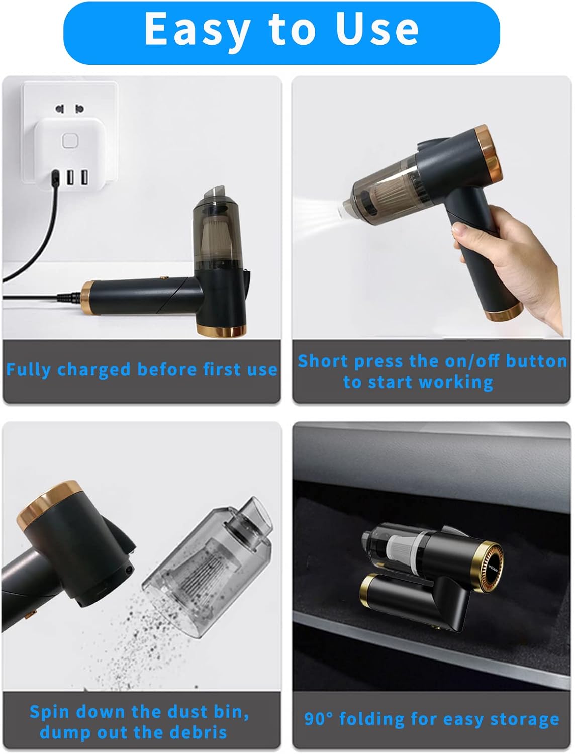 【Mini Size, Folding Design】: Unique 90°foldable handle design, making the handheld vacuum a compact size, can be easily stored in the interior space of the car.