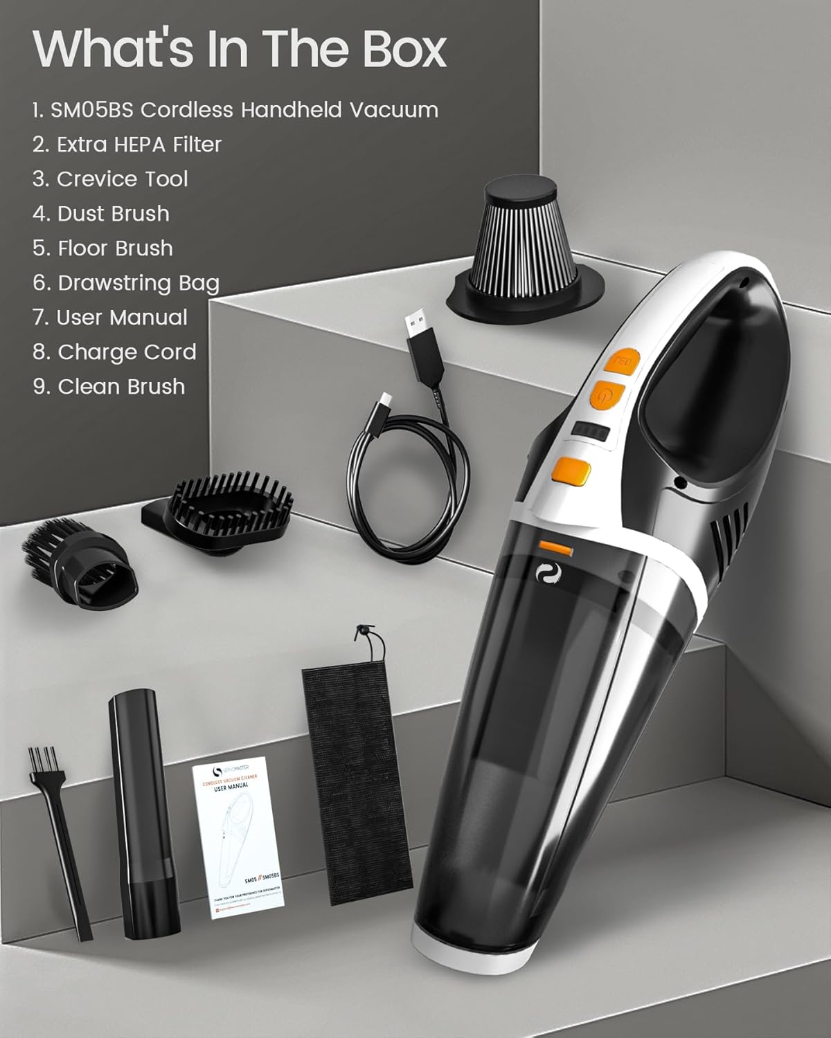 BRUSHLESS MOTOR & 15000PA POWERFUL SUCTION: SM05BS handheld vacuum cordless is equipped with the latest brushless motor which can provide strong suction power of Max 15kPa to effortlessly pick up stubborn dust, debris, peels and pet hair from your home, car or office. It has dual suction modes, ECO-10KPa and MAX-15KPa, for a different cleaning experience! Compared to others, SM05BS mini vacuum cleaner has the advantages of stronger suction power, longer service life and lower noise.
