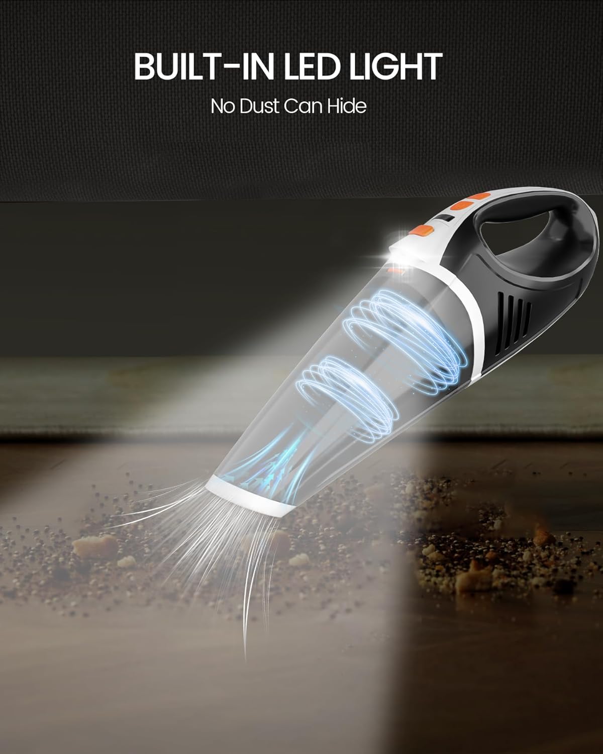 3 PRACTICAL ACCESSORIES & LED LIGHT: This car vacuum cleaner includes a car detailing kit with a crevice tool, floor brush and dust brush. The cordless and ergonomic design makes this small vacuum cleaner easy to hold for cleaning pet hair from your sofa or for cleaning hard-to-reach areas such as nooks and crannies. Meanwhile, this hand vacuum cordless comes with an LED light, so there’s no place for trash to hide in the dark!