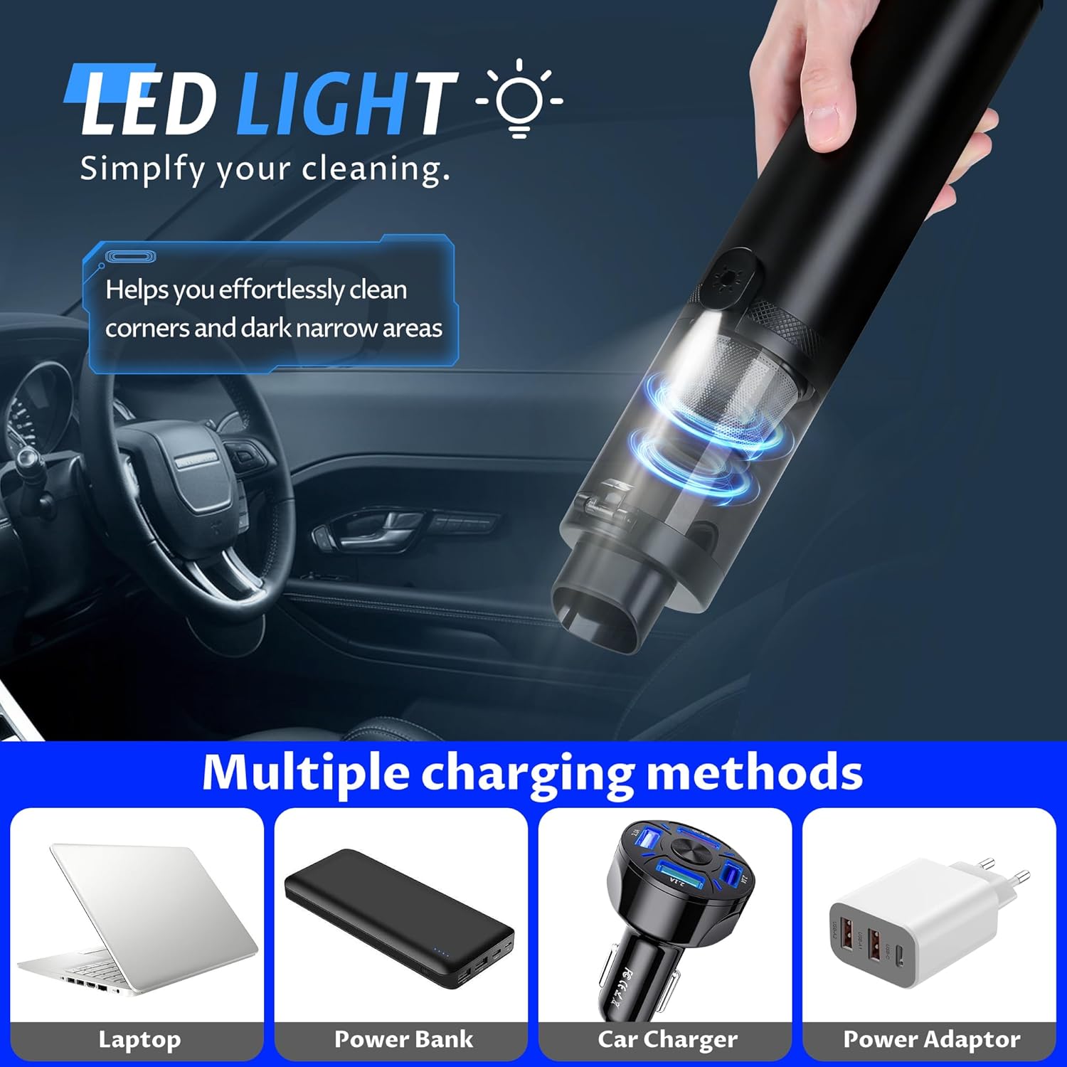 【Cordless Portable Mini Vacuum cleaner】: This hand-held cordless design mini car vacuum cleaner measures 276.5 x65.5mm and weighs just 1.24 pounds.It has the characteristics of light weight and small size, you only need one hand to move it freely anywhere, convenient storage in drawers, cars, storage cabinets or carry-on bags, reduce space occupation, carrying and storing more convenient.It has a built-in LED light design that helps you effortlessly clean corners and dark narrow areas, such as cleaning cars, kitchens, offices, stairs or hard-to-reach corners