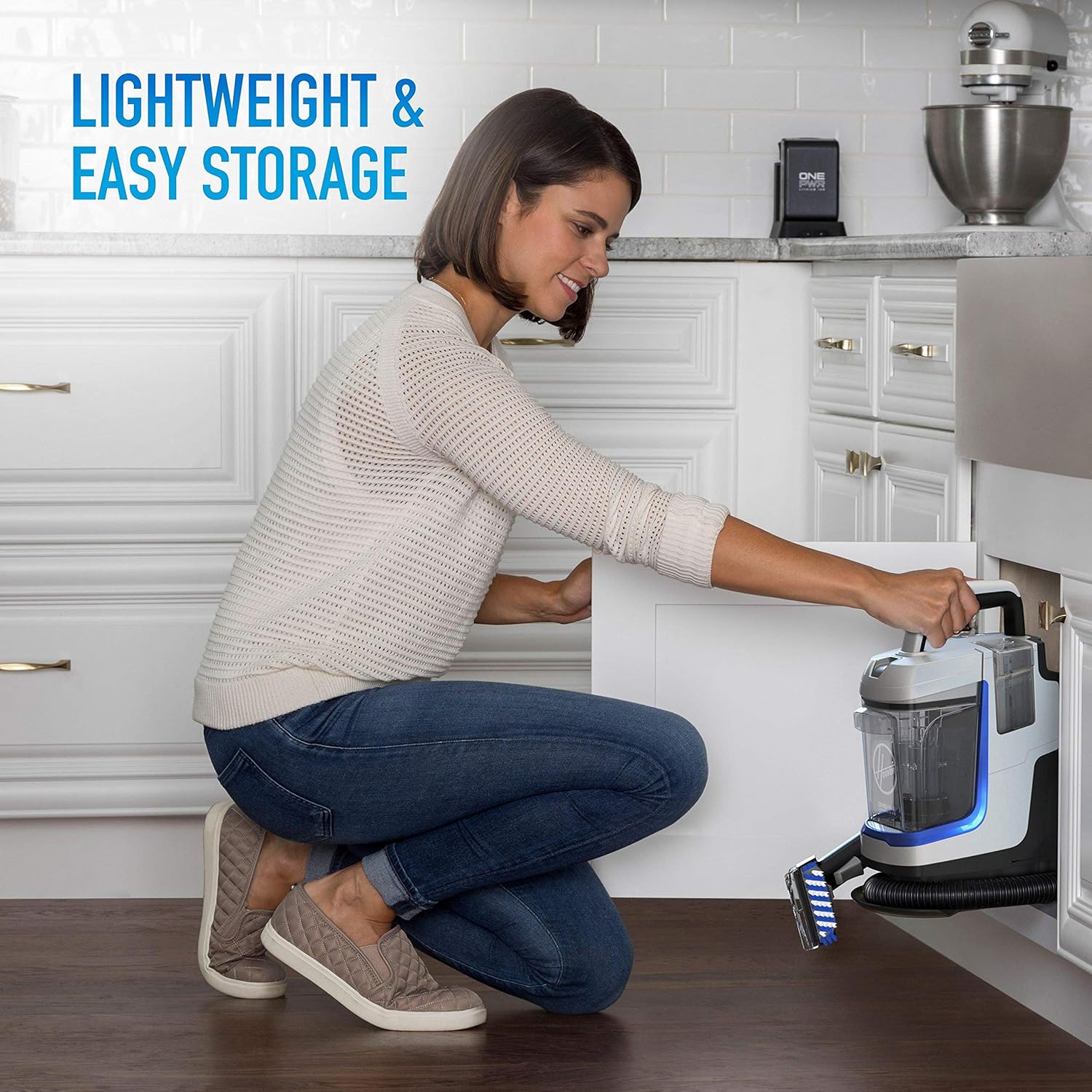 The HOOVER ONEPWR Spotless GO spot cleaner provides lightweight portable convenience to tackle unexpected accidents, spills and pet messes without being tethered to a cord. This spot cleaner easily lifts and removes stains by combining strong suction, cleaning tools, and the power of Hoover cleaning solutions. Its Dual Tanks keep the clean and dirty water separate for an easy fill, empty, and rinse once the job is done. Plus, its compact design makes it perfect to carry and store. Just grab & go and tackle every spill. Every mess. Anytime.