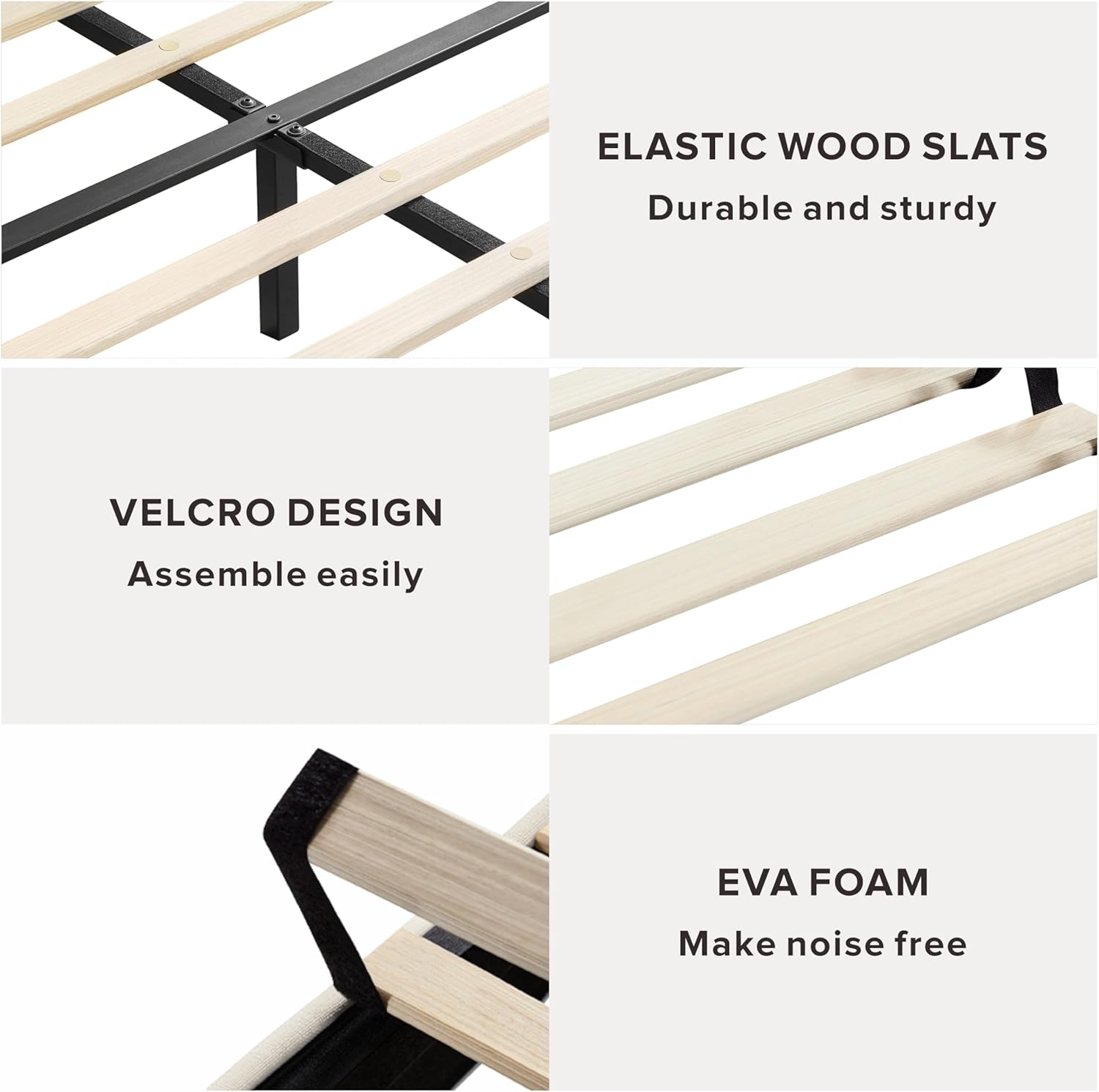 SPECIALIZED SLATS WITHOUT NOISE: Unique locking structure keeps each wooden slat stably fixed to the pillars of the queen size bed frame. Reduces your assembly time, compared with Velcro slat construction, it effectively reduces the swaying of the queen size bed frame, no more squeaking, gives you quiet all night long.