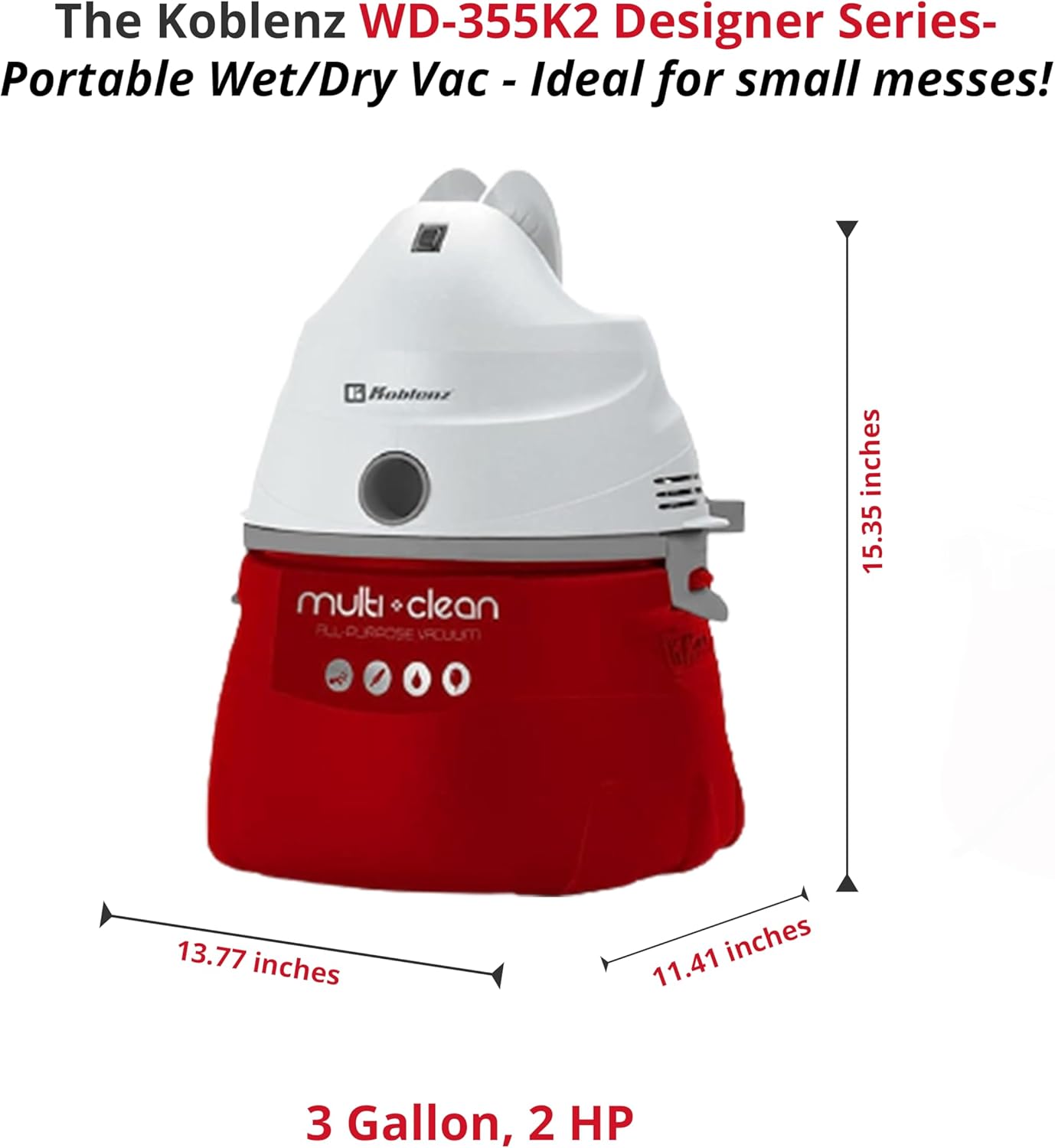 Koblenz WD-355K2 Portable Wet-Dry-Blow Vacuum, 3 Gallon 2.0HP Designer Series, Red,White 5 Year Warranty
