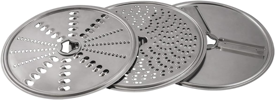 Includes Lid with extra large chute, Pusher, Shredding Blade (Reversible – Coarse/Fine), Grating Blade (Fine Shredding/Grating), Slicing Blade (Reversible – Thick/Thin), Blade support ring, 2 drive couplings: (Long for Universal Plus & Short for Universal Classic) & Blade Drive