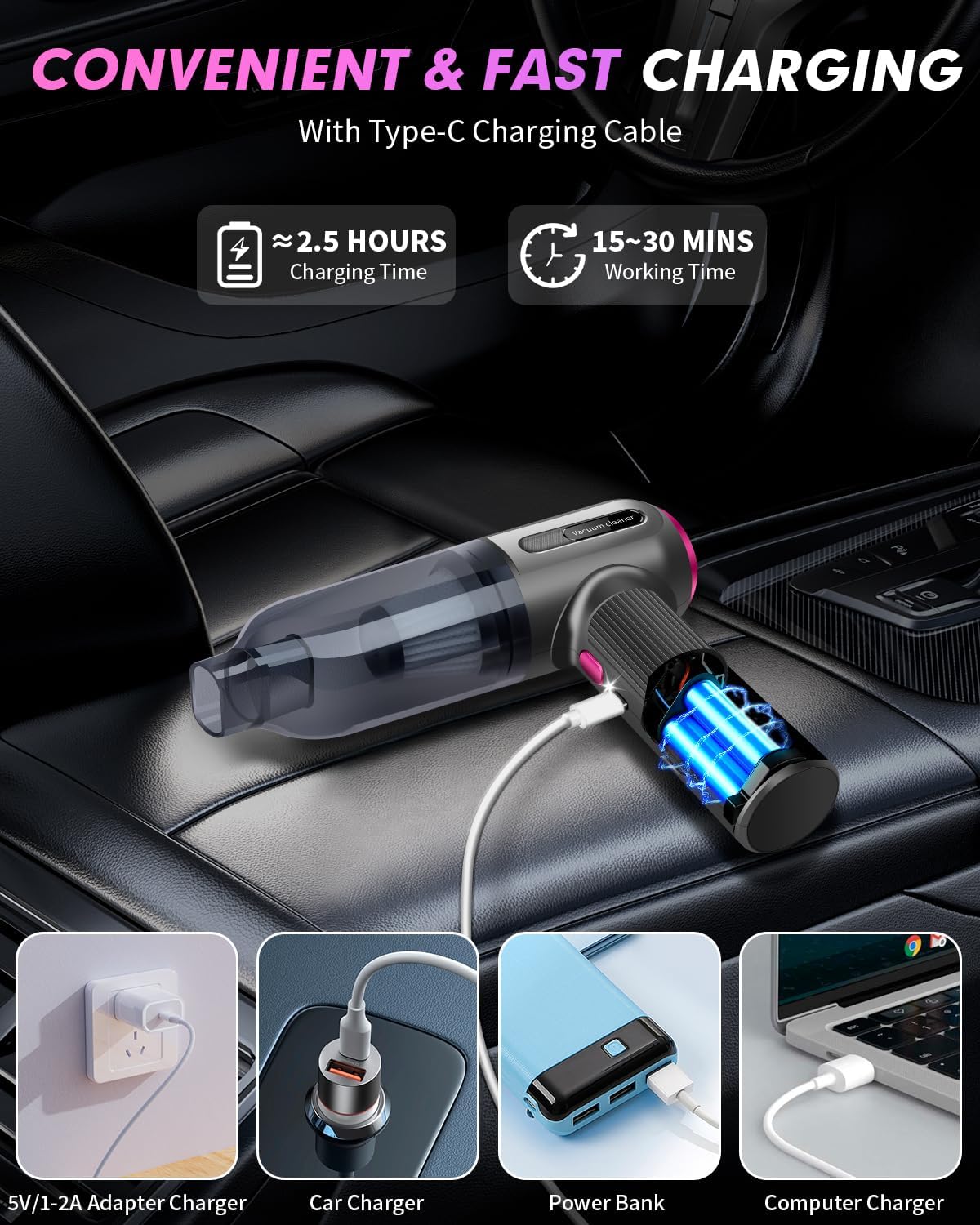 Type-C FAST AND CONVENIENT CHARGING: The cordless handheld car vacuum uses a Type-C charging port with a built-in 2000 mAh rechargeable battery. It takes 2.5 hours to charge quickly and can run for half an hour, making it particularly convenient to charge this handheld hoover anywhere. Using this cordless handheld hoover will save you time for efficient cleaning