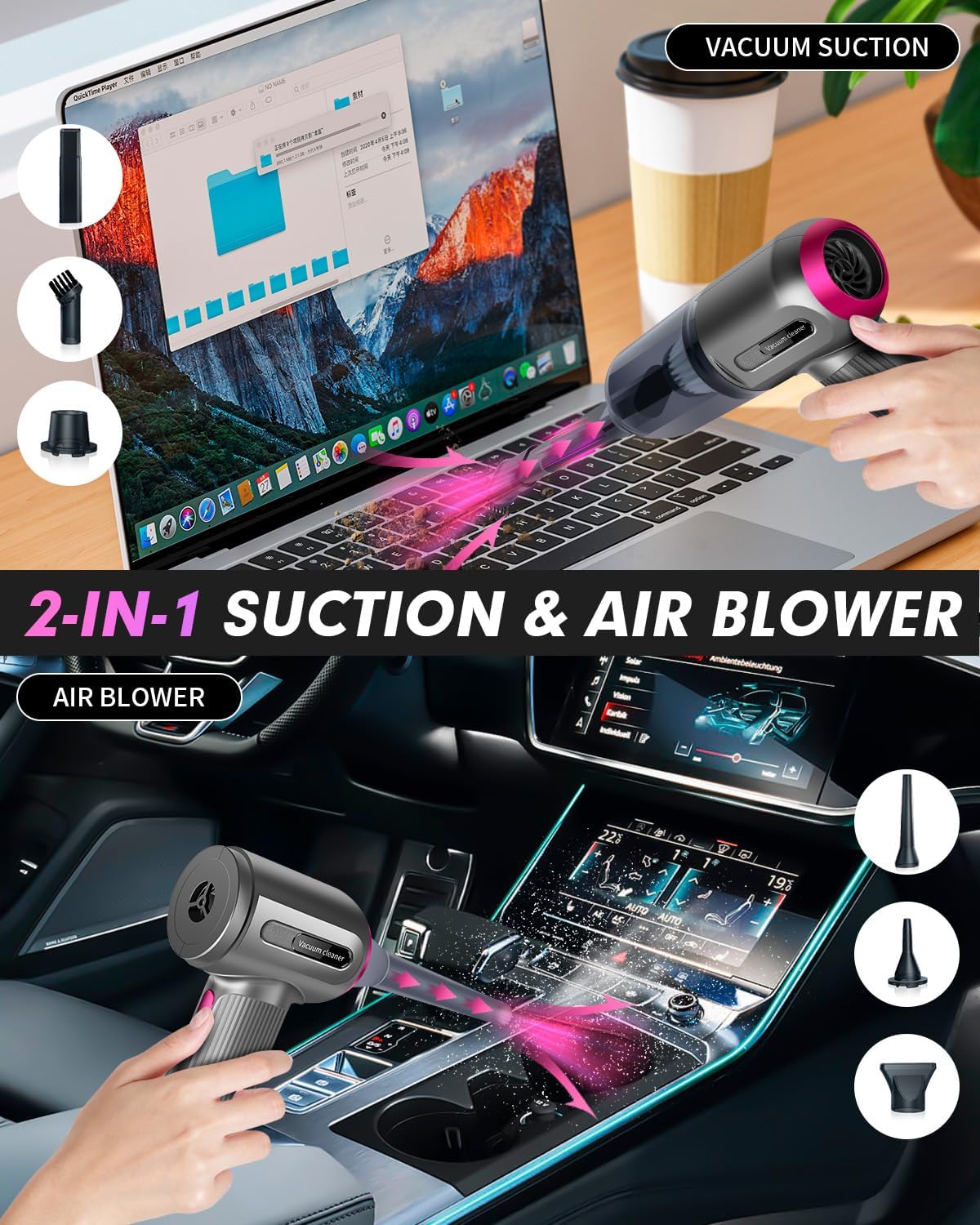 Extended Suction Nozzle: Clean the gaps,drawers,and other inaccessible areas of the sofa seats.Brush Suction Nozzle: Clean up hair and dust on keyboard gaps, dashboard, computer PCB etc.Air Inflation Nozzle: Inflate swimming rings, yoga balls, etc.Vacuum Nozzle: Vacuum the storage bag or inflate the air cushion bed, kayak, etc.Dust Blowing Nozzle: Blow dust, fallen leaves, bonfires, barbecue charcoal fires on the surface of desktop, cars, and blankets etc.Hair Dryer Nozzle: Can be used as a hair dryer to dry clothes hair, etc.
