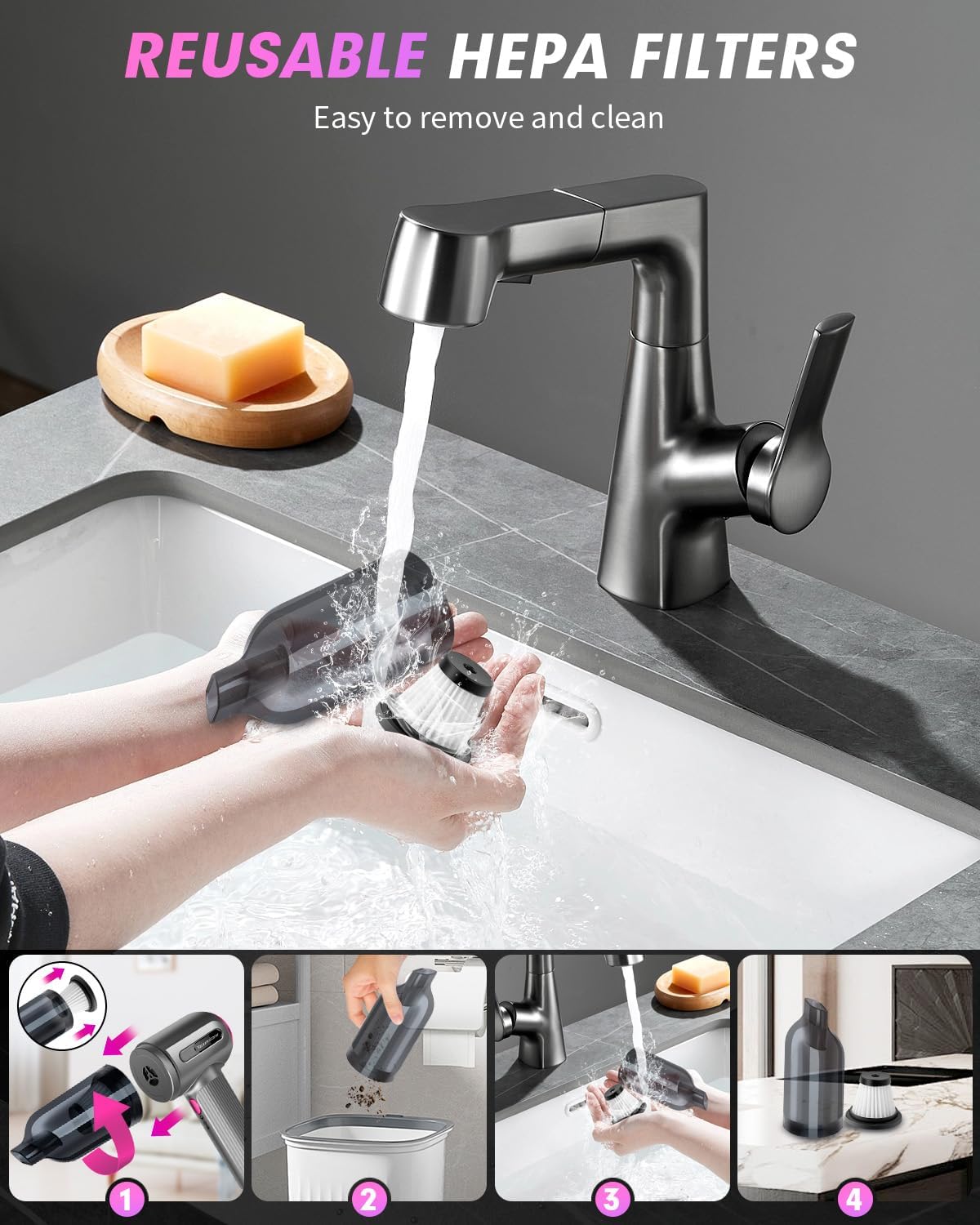ERGONOMIC DESIGN AND WASHABLE HEPA FILTER: The cordless car vacuum has an ergonomic textured handle design that offers a comfortable grip. Easy to assemble and detach. The HEPA filter is washable, but the filter must be completely dry before use. Regular cleaning of the washable filter prevents suction loss and clogging, and maintains good suction power