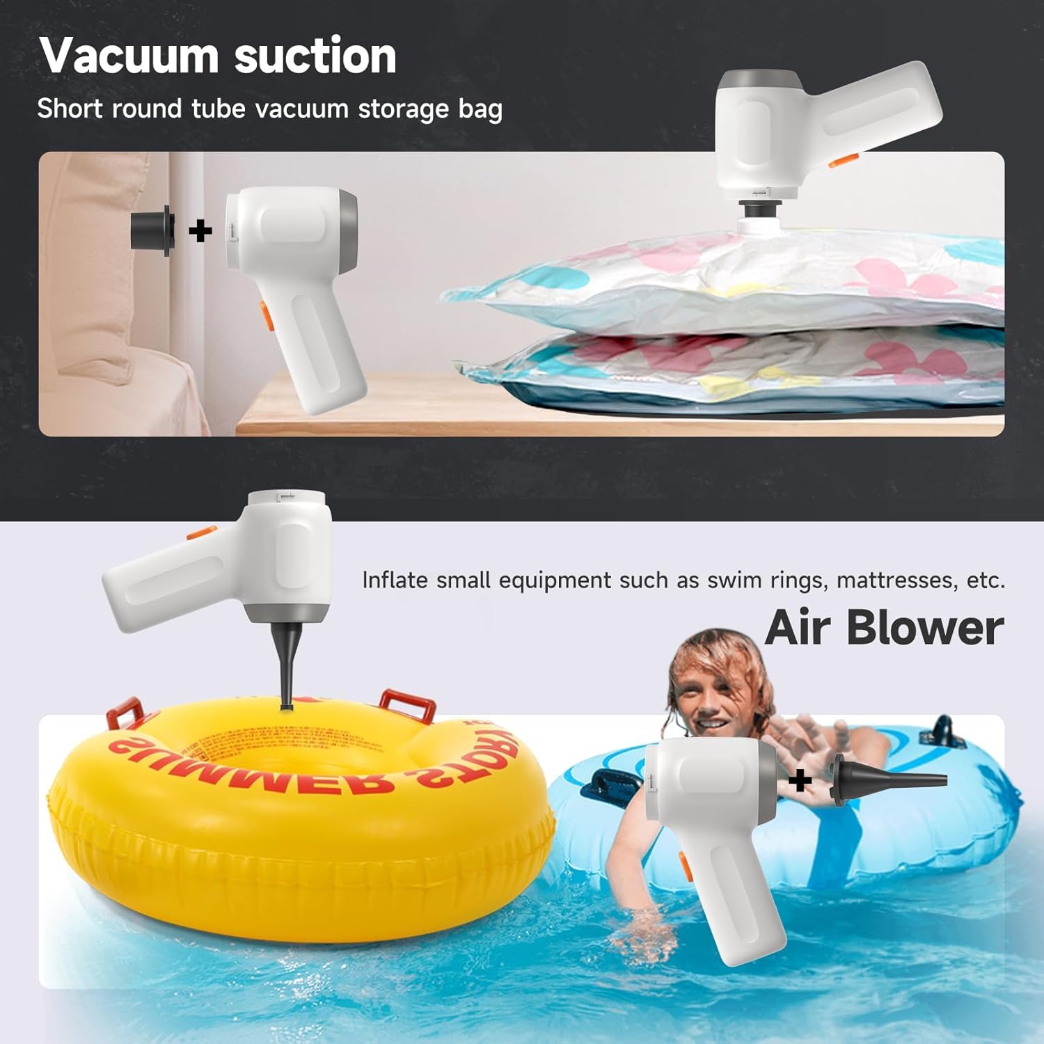 【5 Accessories & Multi-Purpose】The extended nozzle is suitable for you to get into all the hard-to-reach nooks and crannies. A Brush with dual functions of set suction and wipe is suitable for cleaning the dust on the surface of cushions, carpets, keyboards, and air conditioning outlets. The 3 kinds of nozzles can be chosen to inflate swim rings, balloons, and seal the bags for storing clothes and pillows