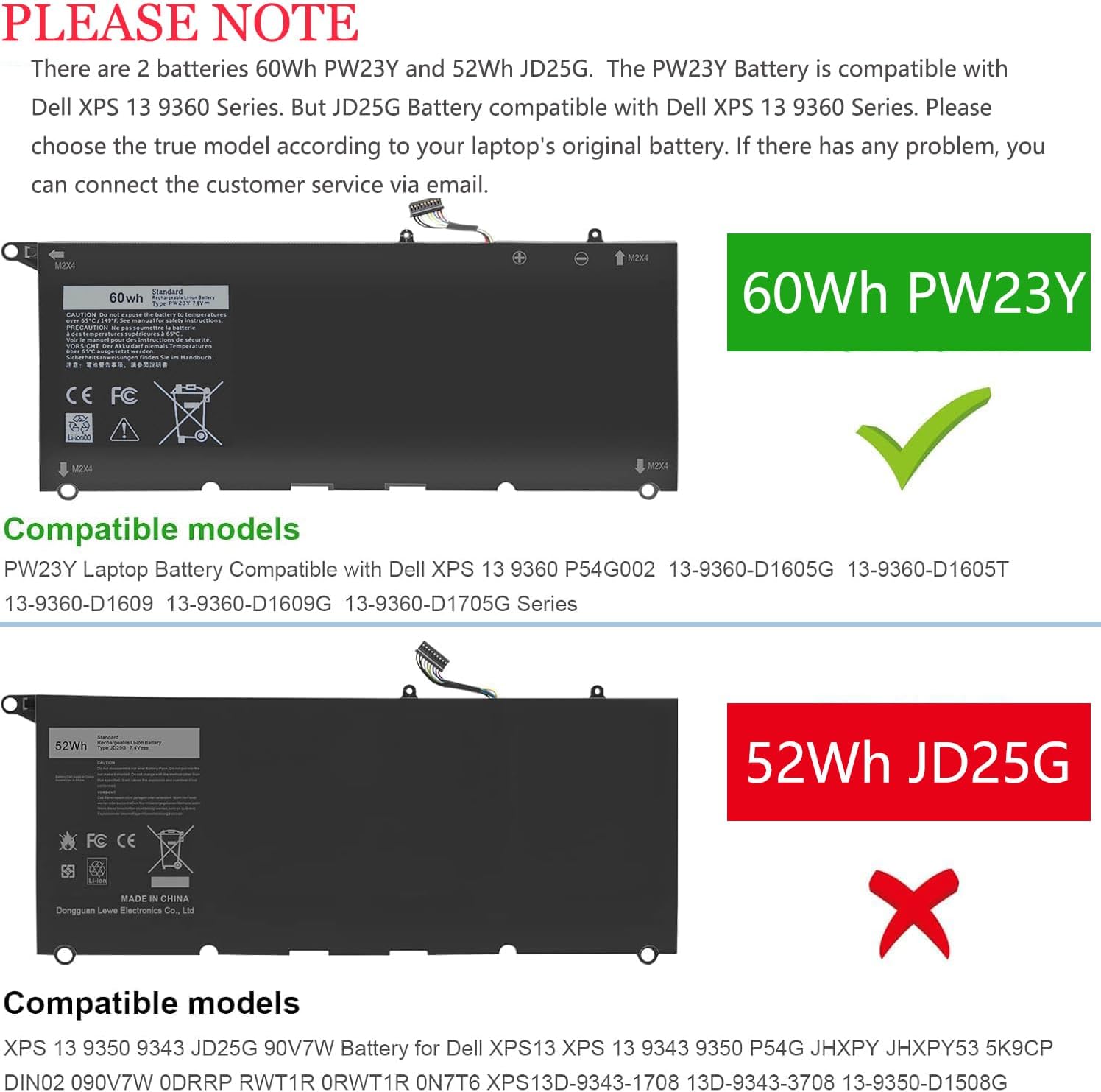 Replacement Battery Part Numbers: PW23Y TP1GT RNP72 0RNP72 0TP1GT 0PW23Y (NOTE: NOT fit for 52Wh JD25G of Dell XPS 13 9350 and xps 13 9343)