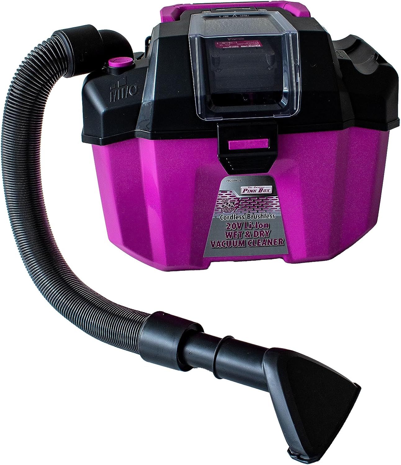 This 20-Volt Lithium-Ion Brushless Cordless 2.6 Gallon Wet/Dry Vacuum by The Original Pink Box® is the perfect tool for quickly cleaning up messes and making sure the job is done right. This two-speed vacuum will suck up dirt, dust, liquids and more quickly and efficiently. The reusable filter can be easily washed and the 2.6 gallon container size gives you enough capacity to handle a variety of projects. It can also be used as a blower so you don’t have to worry about getting out extra equipment. With this cordless wet/dry vacuum, your projects will go smoothly from start to finish! Includes one 2Ah battery and charger. Get the job done in style with The Original Pink Box®!