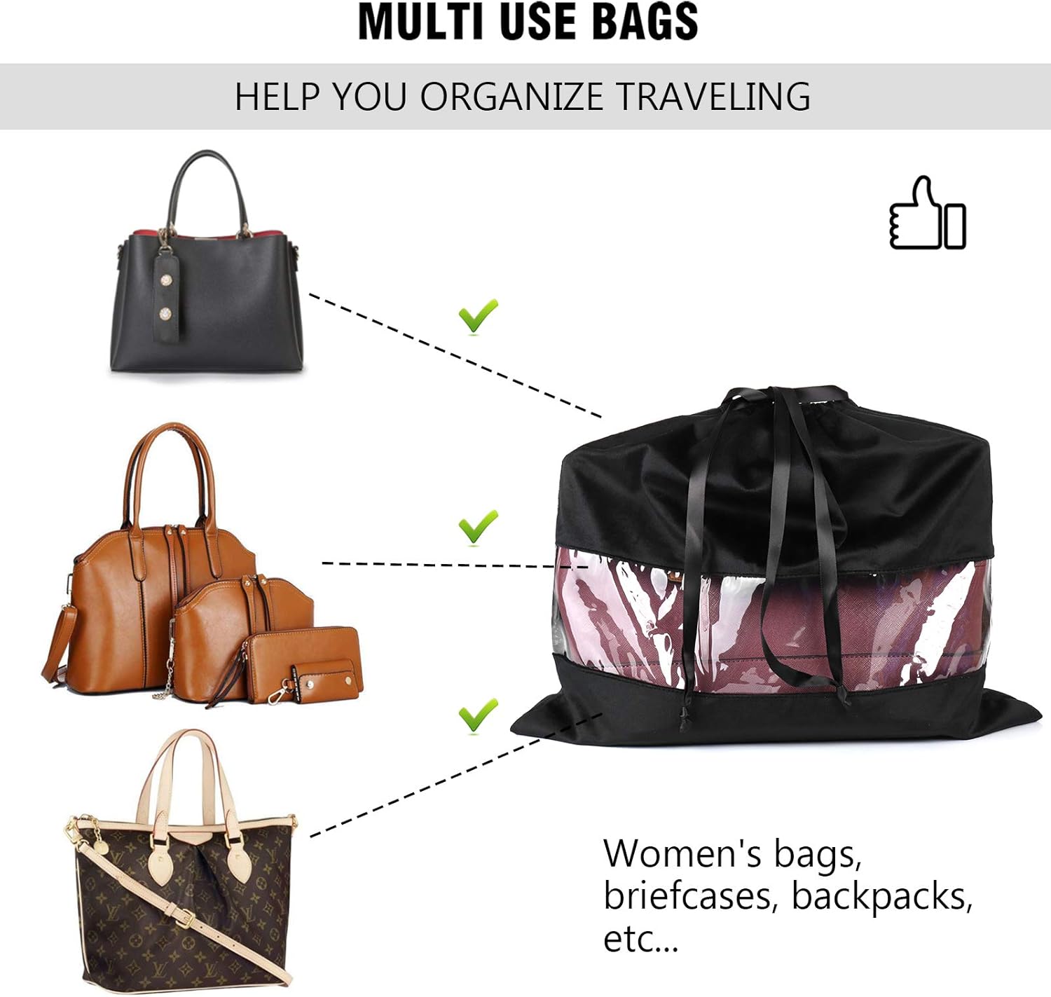 ❤️ These bags are not just great for protecting handbags, they are the perfect travel storage bags. Use them to store and organize shoes, boots, electronics, backpacks, cables, accessories, toiletries, cosmetics, make up and much more while traveling