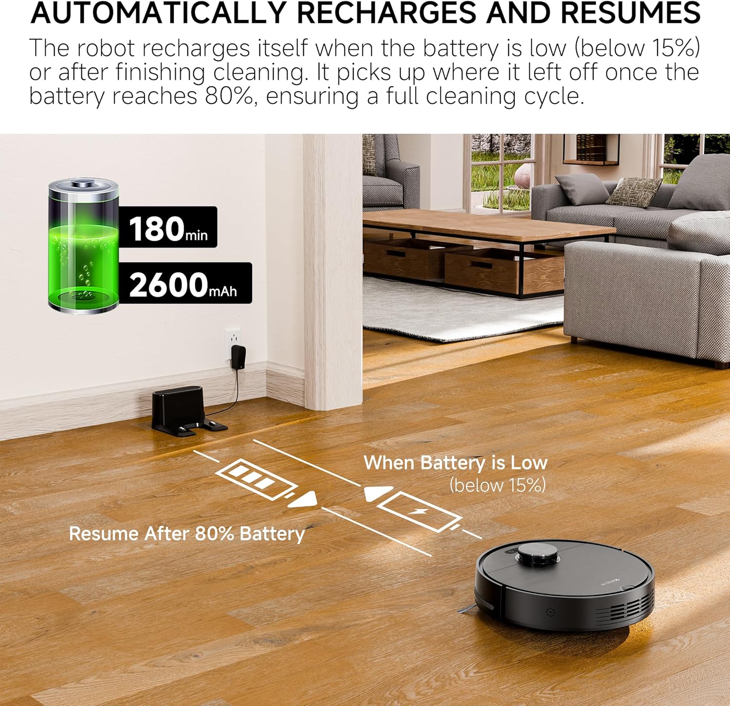 【Automatic Cleaning and Charging】This robot vacuum cleaner automatically performs routine cleaning according to a preset schedule; when the battery is low, it automatically returns to the charging dock. If the cleaning is not completed, it will automatically return to charge to 80%, and the robot will return to complete the remaining cleaning work. Each full charge can run for 180 minutes