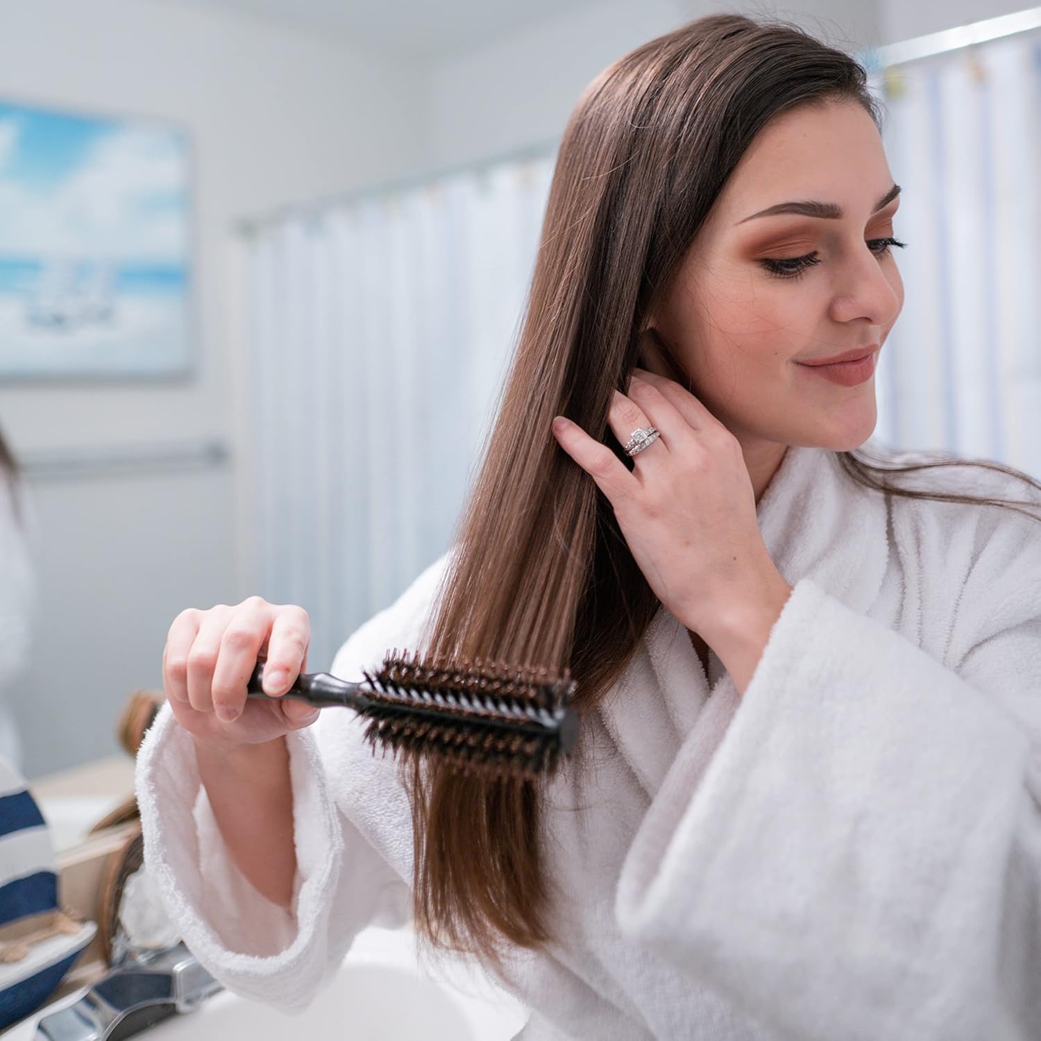 This is a very nice hair brush. Easy to handle, straightens and styles – While the bristles are great, the most important feature for me and my long hair is that there is no rubber ring or other annoying feature on the handle like most brushes – THIS Brush has a Plain yet Comfortable Wooden Handle…BRAVO! and thank you for not adding those annoying rubber grips that always catch my hair. Exactly what I was looking for and would recommend.