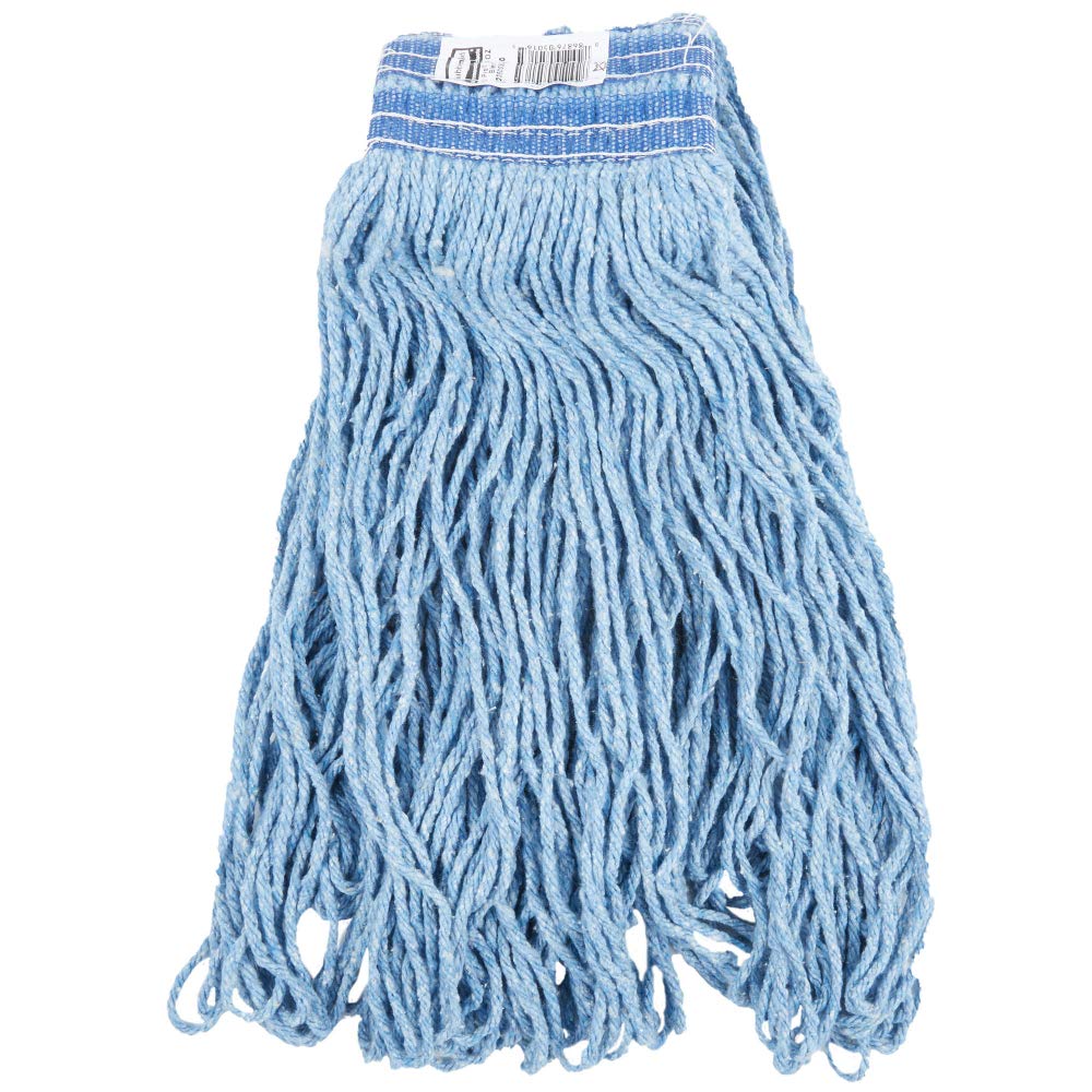 Rubbermaid Commercial FGE23800BL00 Universal Headband Blue Blend Mop, 24-ounce. Balanced blend of post-industrial 4-ply cotton and synthetic fibers for higher absorbency and strength. Looped ends reduce fraying associated with cut-end mops. Universal headband fits both side-loading and clamp-style handles. LEED-point qualified.20.75 inches long by 6.583 inches wide by 2.813 inches high. 1.583 pounds. Made in the USA.