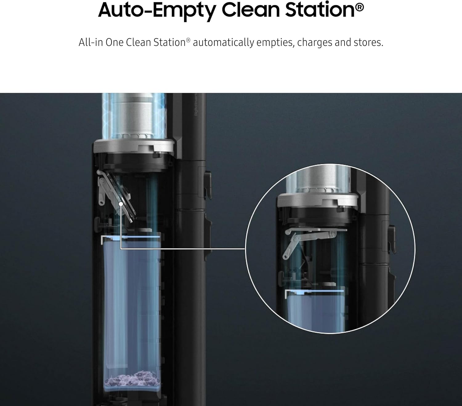 Design meets function in the most powerful, premium cordless stick vacuum with auto empty*. Bespoke Jet™ AI Cordless Stick Vacuum includes our most powerful HexaJet™ 2.0 motor** and delivers up to 100 minutes*** of runtime in a single charge. AI Cleaning Mode automatically senses floor type and optimizes suction whether on carpet or hard floor for efficient cleaning performance on any surface. Innovative design combines with the All-in-One Clean Station which auto-empties, charges, and stores your vacuum, for one show-stopping solution. Take the hassle out of removing unsightly hair; Easily remove the roller with the press of a button to get rid of any tangled hair. 5-layer filtration separates, filters, and traps up to 99.999%****** of microdust particles*******. Long Reach Crevice Tool reaches tight corners, crevices, and other difficult-to-access areas in your home or car. Combination Tool converts for dusting or cleaning upholstery. The washable dustbin and filters help to remove odors and maintain optimal performance. Telescopic design includes a 3-position wand to adjust the height of the vacuum. *Suction power tested to IEC 62885-4:2020; premium cordless stick vacuums defined as $650 or above. **Versus Samsung’s Bespoke Jet VS9000 motor. ***The stated run time applies to the minimum power level with a non-motorized tool attached. Results may vary depending on actual usage. Longest battery life when compared to single battery life of other cordless stick vacuums. ****Refers to dust particles smaller than 5.5mm. *****Available on Android and iOS devices. A 5GHz Wi-Fi connection and Samsung account are required. ******Tested in accordance with the IEC 62885-2, CL.5.11 standard, using the Jet mode. Results may vary ¬¬¬¬¬¬–¬¬¬¬¬¬depending on actual usage. *******Refers to dust particles in the size range of 0.5 to 4.2µm.
