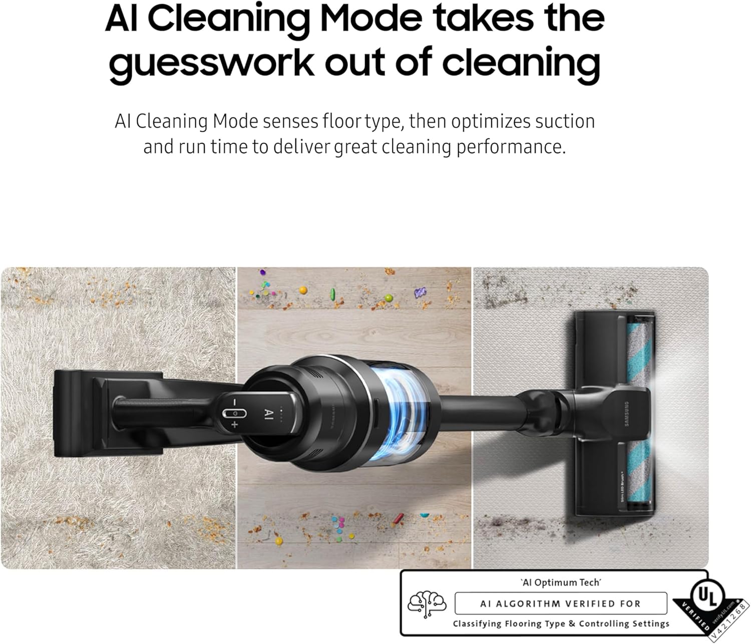 AI CLEANING MODE: AI Cleaning Mode automatically senses floor type and optimizes suction, whether on hardwood or carpet, for efficient cleaning performance; It optimizes battery runtime, so you get the most cleaning time between charges